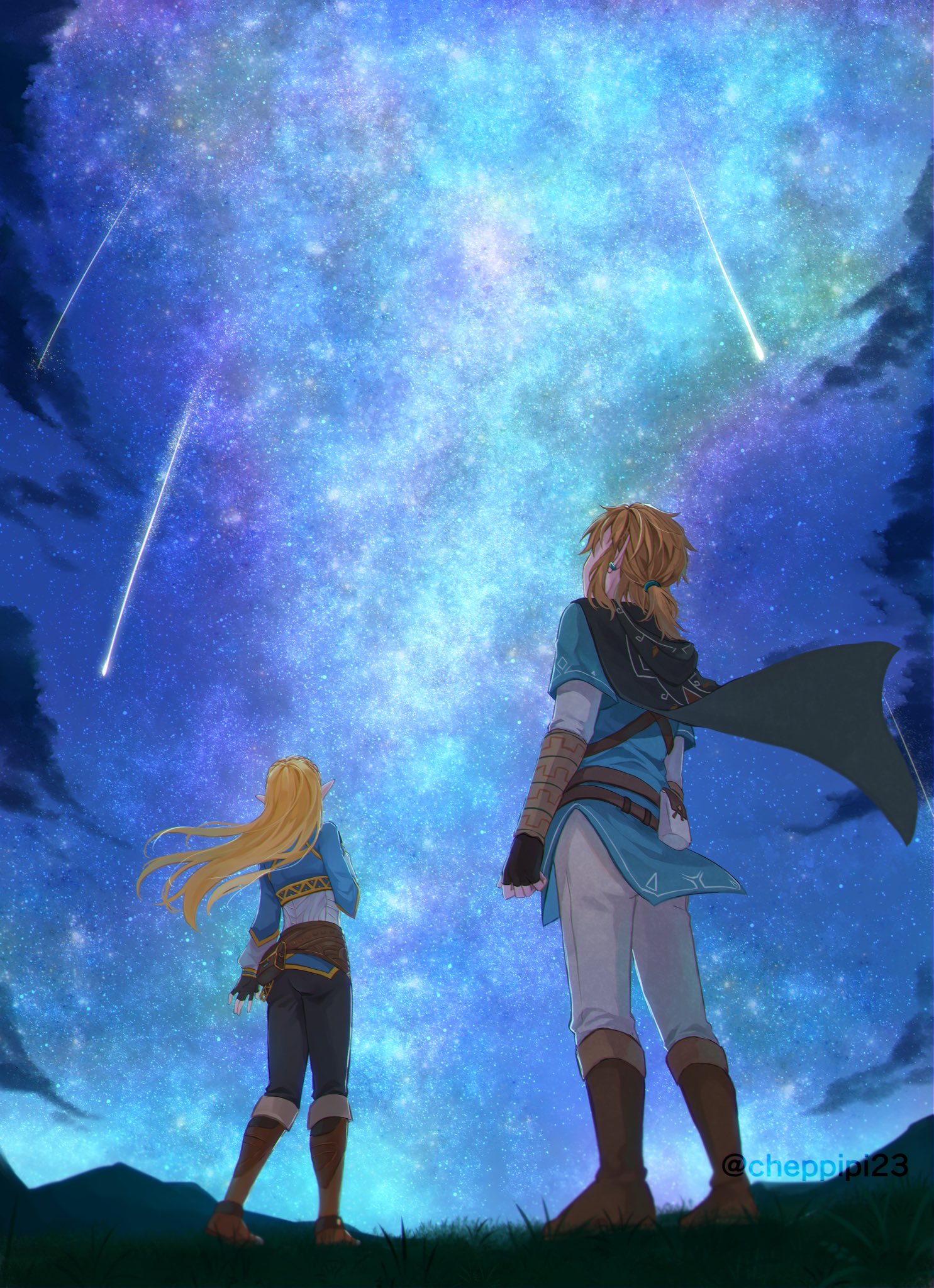 1boy 1girl aurora black_pants blonde_hair blue_shirt blue_tunic boots brown_footwear cape earrings facing_away fingerless_gloves from_above from_behind full_body gloves grass highres jewelry link long_hair looking_up low_poly medium_hair night nintendo outdoors pants pointy_ears princess_zelda shirt shooting_star sidelocks sky standing the_legend_of_zelda the_legend_of_zelda:_breath_of_the_wild tree tunic white_pants white_shirt yayoi_(chepiiii23)