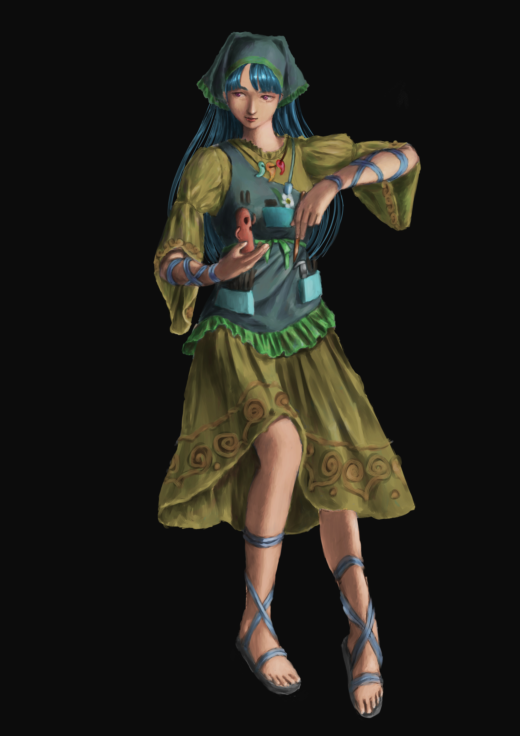 1girl absurdres apron arm_ribbon black_background blue_hair chisel dress green_apron green_headscarf green_headwear haniwa_(statue) haniyasushin_keiki headscarf highres jewelry knife kuinde_(hham7778) long_hair magatama magatama_necklace necklace paintbrush pink_eyes pliers ribbon sandals simple_background single_strap solo tools touhou wood_carving_tool yellow_dress yellow_sleeves