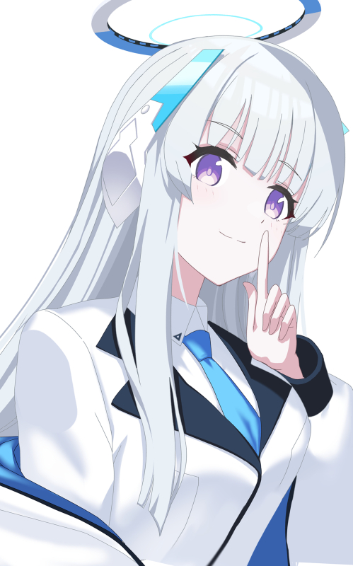 1girl blue_archive blue_necktie breasts closed_mouth collared_shirt commentary_request grey_hair halo hand_up headgear jacket long_hair long_sleeves medium_breasts necktie noa_(blue_archive) puffy_long_sleeves puffy_sleeves purple_eyes shirt shooka simple_background smile solo upper_body white_background white_jacket white_shirt