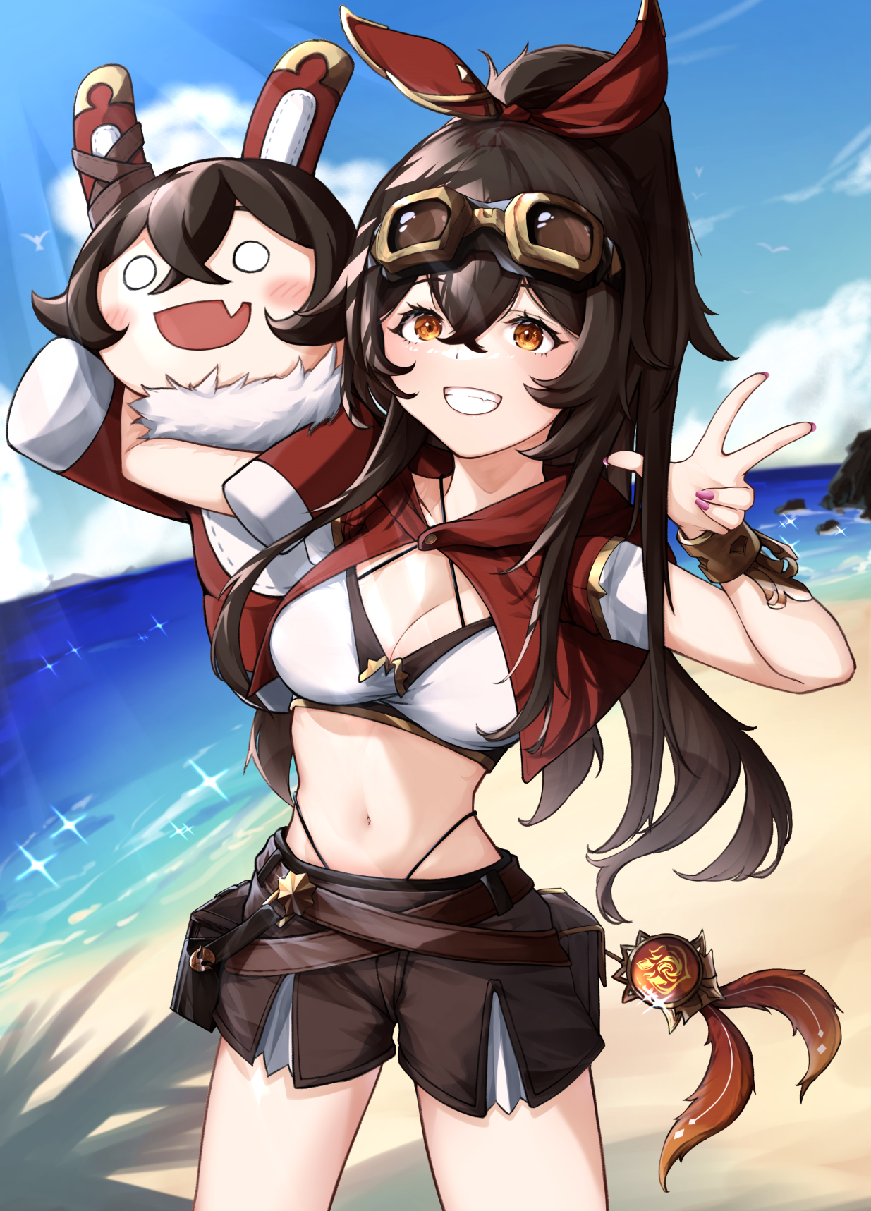1girl :d alternate_costume alternate_hairstyle amber_(genshin_impact) bag baron_bunny_(genshin_impact) beach black_hair blue_sky blurry breasts brown_eyes cleavage cloud cloudy_sky commentary_request depth_of_field esto_0079 genshin_impact goggles goggles_on_head grin hair_between_eyes highres horizon long_hair looking_at_viewer medium_breasts midriff nail_polish ocean open_mouth ponytail ribbon short_shorts short_sleeves shorts sidelocks sky smile solo stomach stuffed_animal stuffed_rabbit stuffed_toy v vision_(genshin_impact)