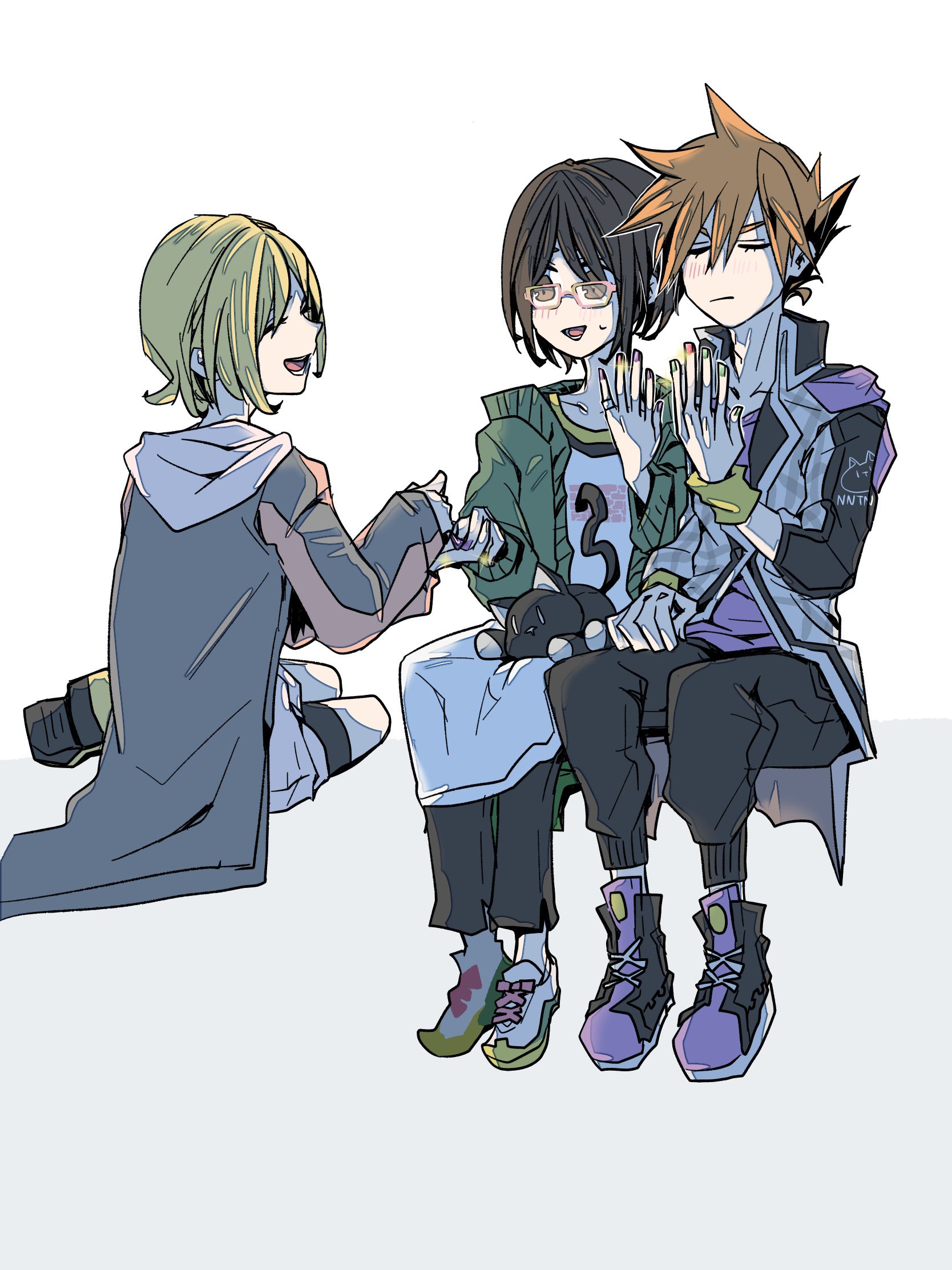 1boy 2girls bito_raimu black_pants blonde_hair blush closed_eyes closed_mouth glasses green_jacket grey_jacket highres hood hooded_jacket jacket jewelry misaki_shiki multicolored_nails multiple_girls nail_polish nyantan open_mouth orange_hair painting_nails pants plaid_clothes plaid_jacket purple_shirt ring sakuraba_neku shin_subarashiki_kono_sekai shirt short_hair smile spiked_hair stuffed_animal stuffed_cat stuffed_toy subarashiki_kono_sekai unworn_headwear white_shirt wristband