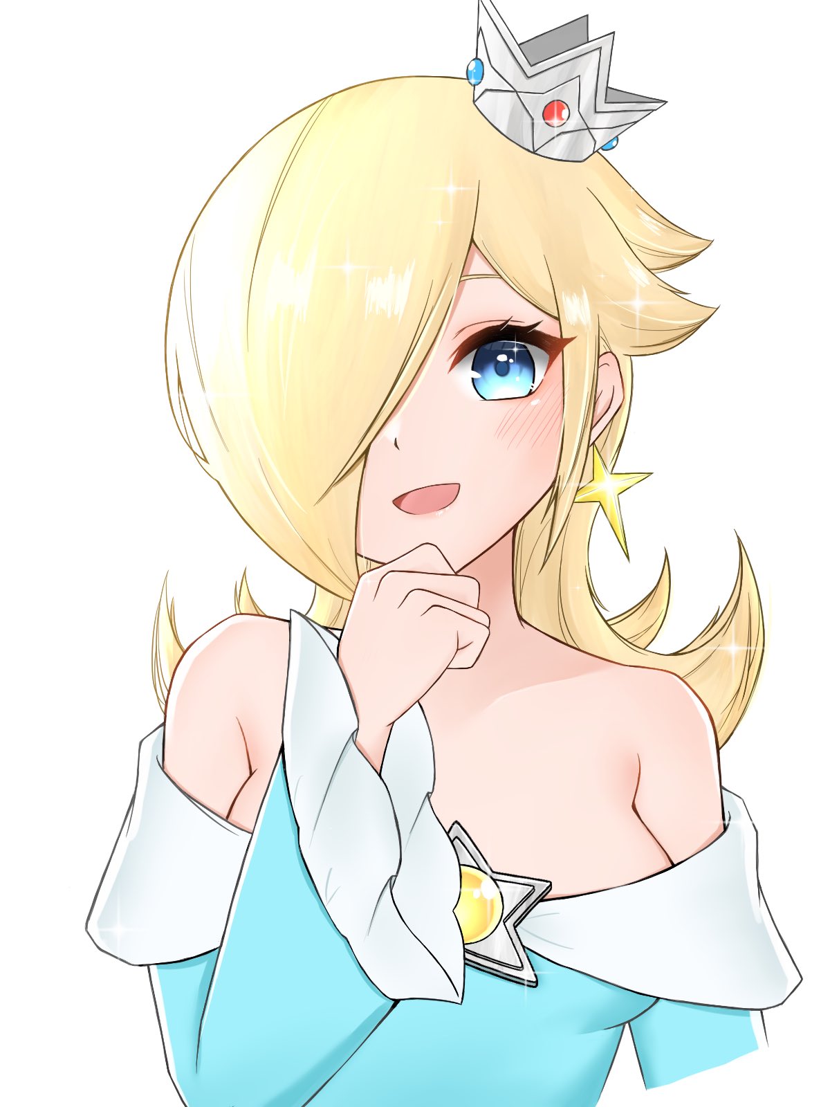 1girl :d aqua_dress bare_shoulders blonde_hair blue_eyes blush collarbone commentary_request crown dress earrings eyelashes frilled_sleeves frills hair_over_one_eye hand_on_own_chin hand_up highres jewelry long_hair long_sleeves looking_at_viewer mario_(series) nintendo off-shoulder_dress off_shoulder one_eye_covered open_mouth parted_bangs rosalina sidelocks simple_background single_earring smile solo sparkle star_(symbol) star_earrings super_mario_galaxy swept_bangs tomatomiya upper_body white_background wide_sleeves