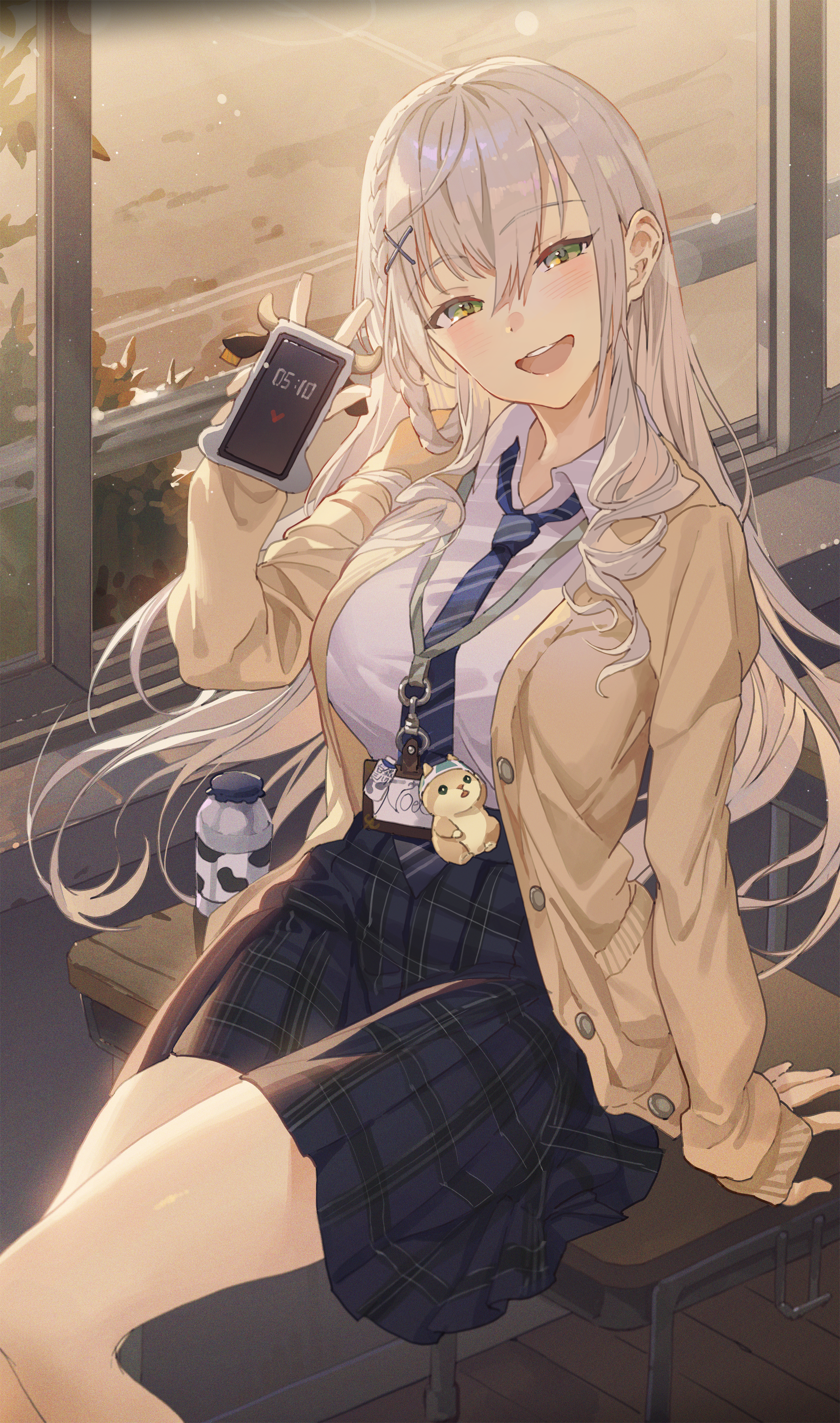 1girl absurdres blue_necktie blue_skirt blush bottle braid cellphone chipmunk classroom collared_shirt desk feet_out_of_frame green_eyes grey_hair hamster highres holding holding_phone hololive hxxg indoors jacket lanyard long_hair looking_at_viewer necktie on_desk open_clothes open_jacket open_mouth phone plaid_clothes plaid_skirt pop_(shirogane_noel) shirogane_noel shirogane_noel_(school_uniform) shirt sitting skirt smartphone smile solo squirrel teeth tree upper_teeth_only virtual_youtuber white_shirt window yellow_jacket