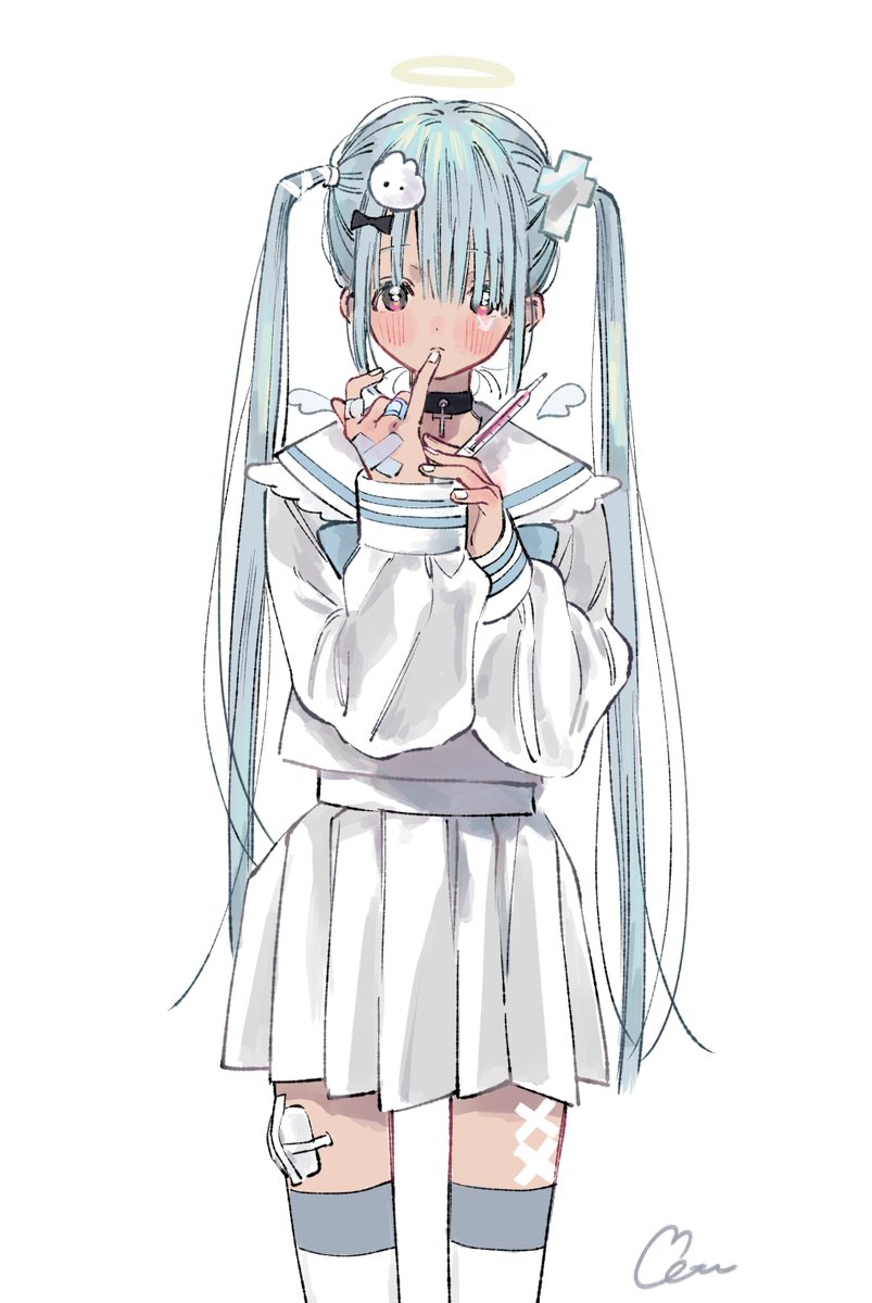 1girl bandaid blouse blue_hair blush hair_ornament hair_ribbon halo highres long_hair neckerchief original pink_eyes pleated_skirt ribbon sailor_collar school_uniform serafuku shirt simple_background skirt solo standing twintails twintails_day wata_kinoshi white_background wings