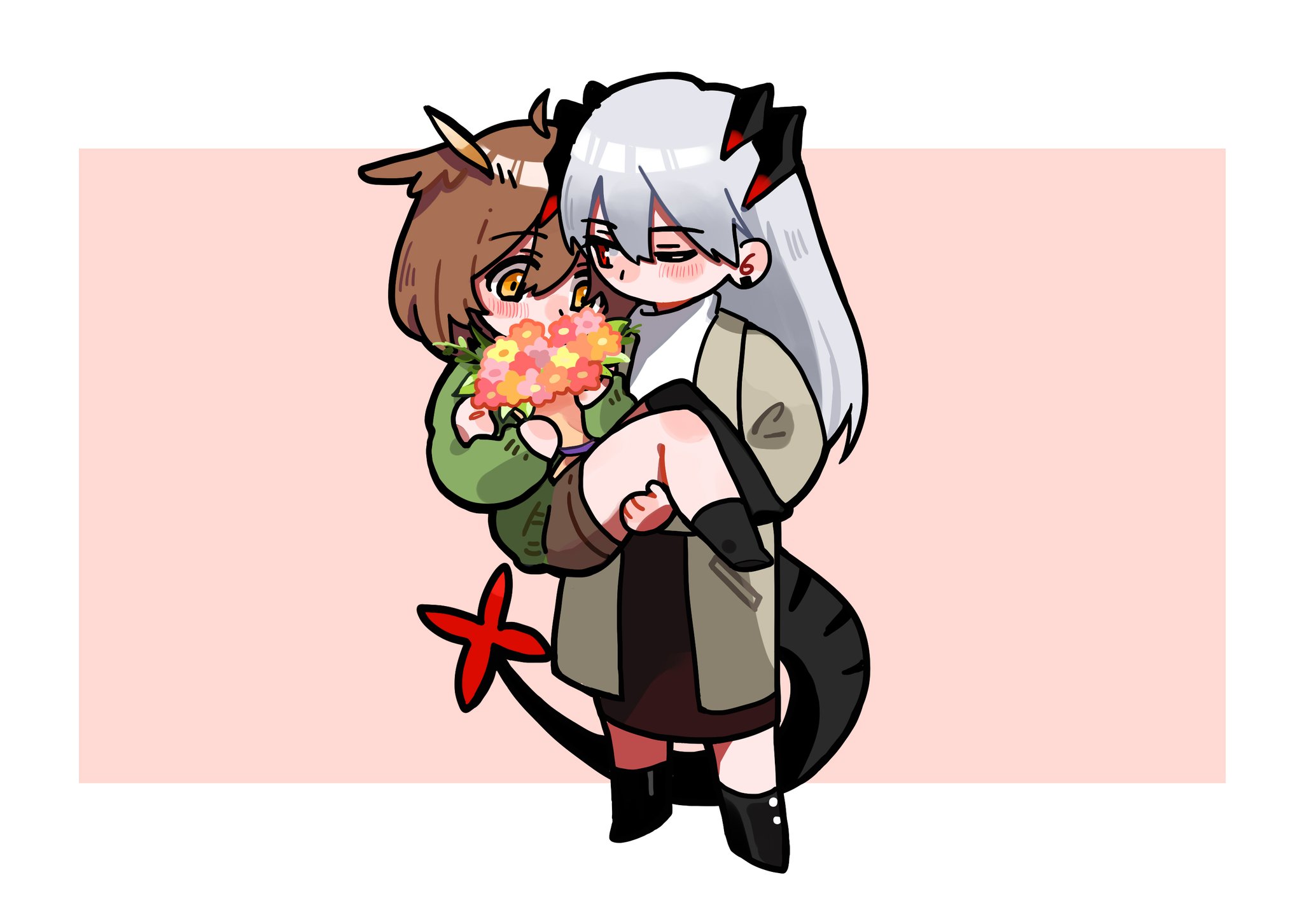 2girls arknights black_footwear black_skirt border bouquet brown_footwear brown_hair brown_shorts carrying chibi coat dragon_girl dragon_tail feather_hair flower glasses green_sweater grey_hair highres holding holding_bouquet horns multiple_girls one_eye_closed orange_eyes overcoat owl_ears owl_girl pink_background princess_carry rotem_02 saria_(arknights) shorts silence_(arknights) skirt sweater tail turtleneck turtleneck_sweater white_border white_sweater