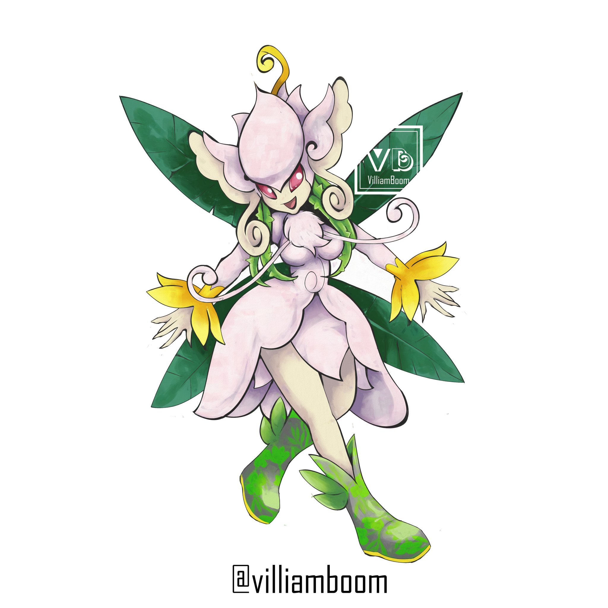 digimon fusion gen_7_pokemon highres lilimon lurantis nintendo pokemon red_eyes simple_background smile solo villiam_boom white_background wings