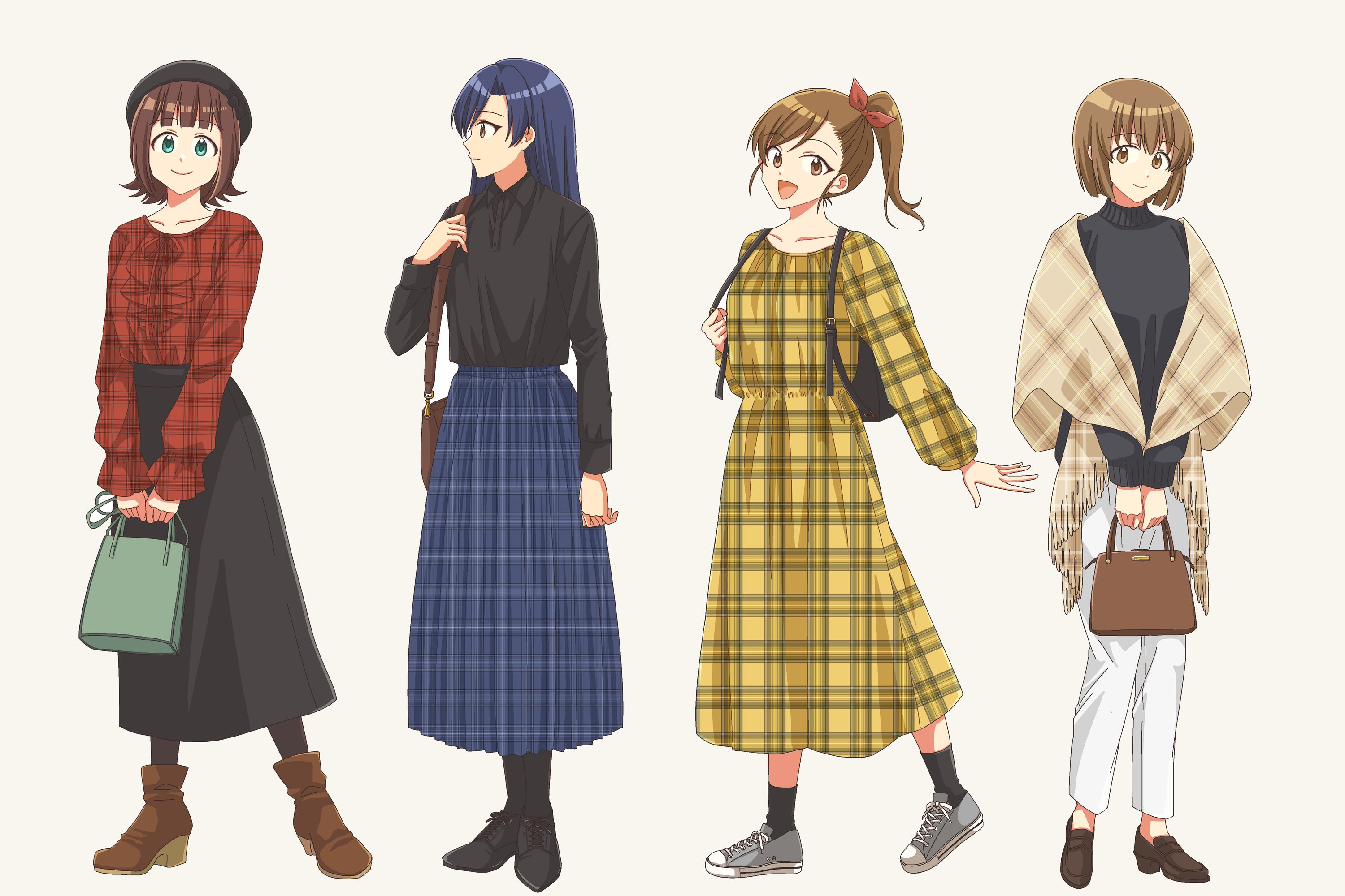 4girls amami_haruka backpack bag black_shirt black_sweater boots denim dress futami_mami hagiwara_yukiho handbag highres idolmaster idolmaster_(classic) jeans kisaragi_chihaya multiple_girls pants plaid_clothes plaid_shirt plaid_skirt pleated_skirt red_shirt shawl shirt shoes short_hair skirt skrmyg sneakers sweater white_background yellow_dress