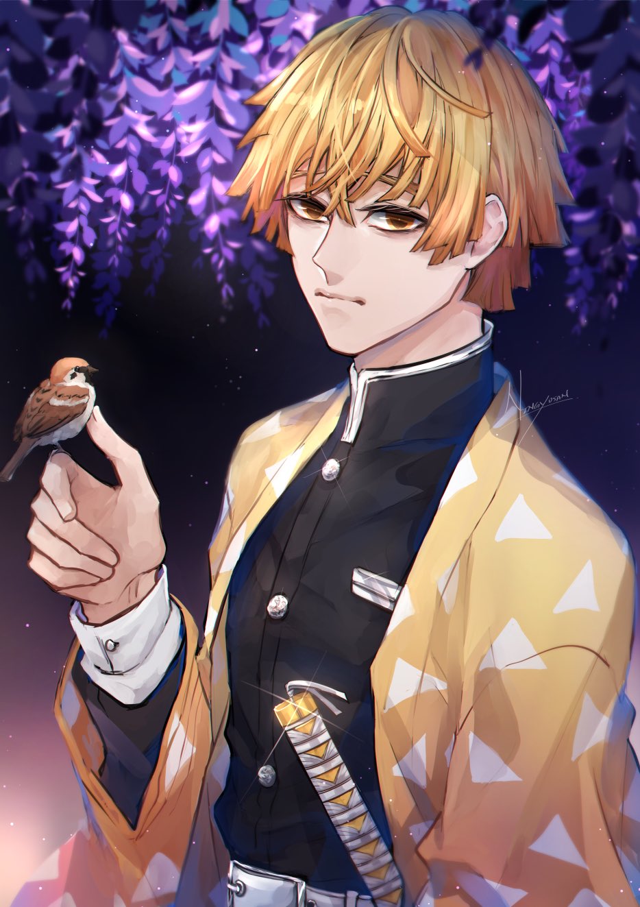 agatsuma_zenitsu belt bird bird_on_hand black_jacket blonde_hair blunt_bangs blunt_ends brown_eyes brown_hair closed_mouth colored_tips demon_slayer_uniform flower hair_between_eyes high_collar highres jacket japanese_clothes katana kimetsu_no_yaiba kimono long_sleeves looking_at_viewer male_focus multicolored_hair ningyo print_kimono short_hair sword triangle_print upper_body weapon white_belt wisteria yellow_kimono
