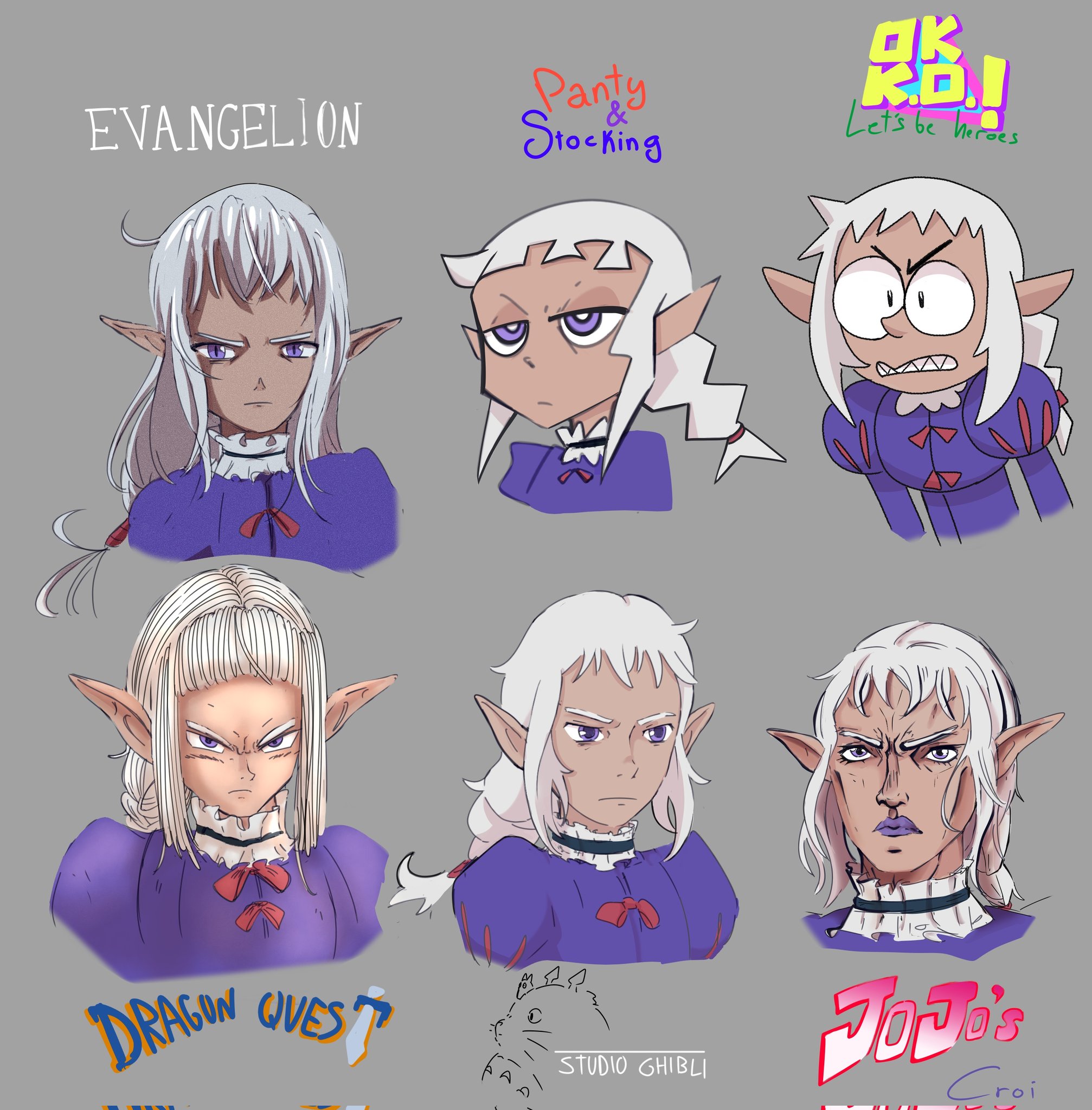 1boy croiplant dark_elf dragon_quest dungeon_meshi elf frown furrowed_brow highres jojo_no_kimyou_na_bouken looking_at_viewer miyazaki_hayao_(style) neon_genesis_evangelion ok_k.o.!_let's_be_heroes panty_&_stocking_with_garterbelt parody pointy_ears purple_eyes purple_lips purple_shirt sharp_teeth shirt studio_ghibli studio_ghibli_(style) style_parody teeth thistle_(dungeon_meshi) toriyama_akira_(style) white_hair