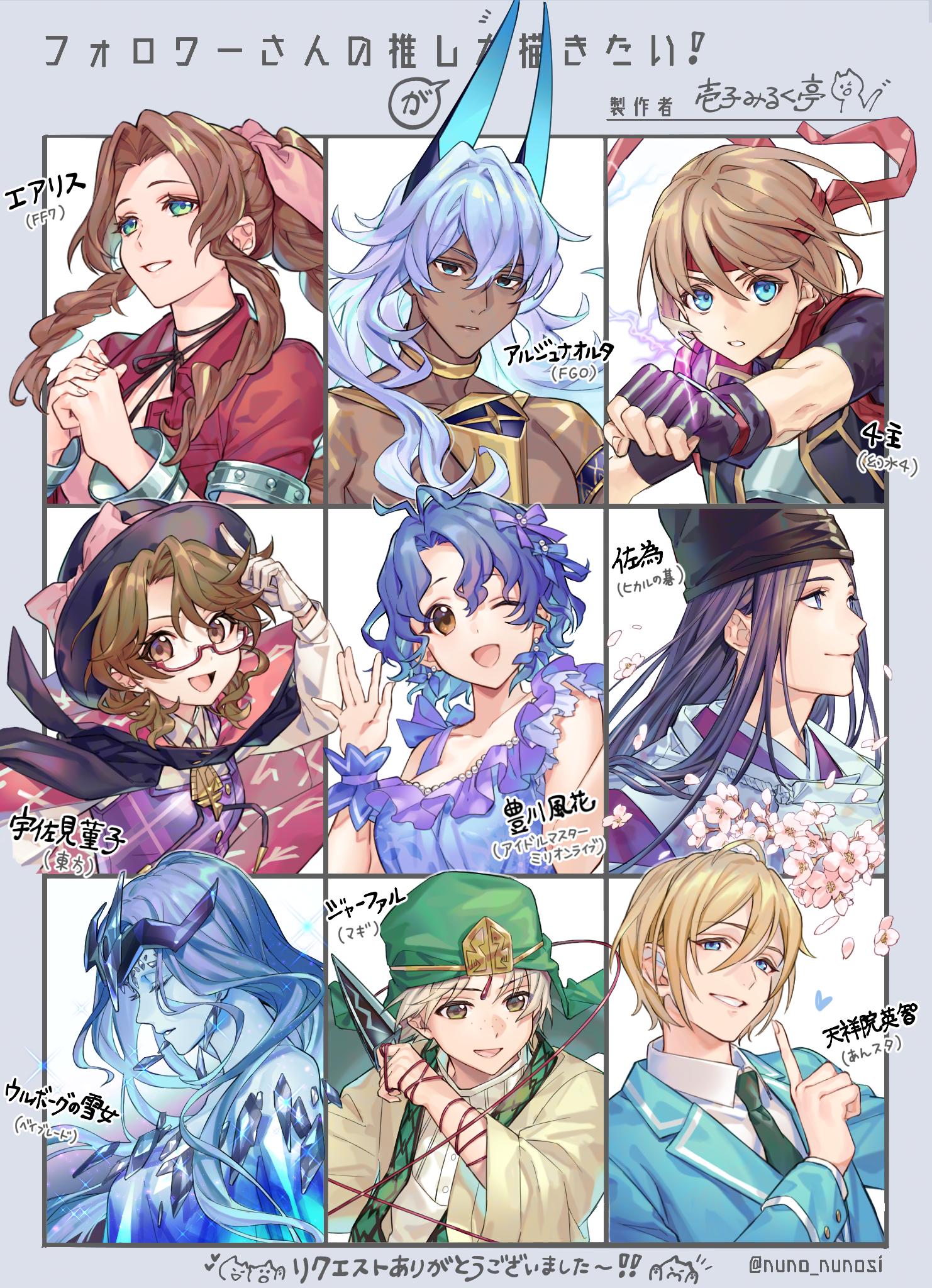 1boy 4girls 5boys aerith_gainsborough ahoge androgynous aqua_eyes aqua_jacket arjuna_(fate) arjuna_alter_(fate) arjuna_alter_(first_ascension)_(fate) armlet artist_name bangle bare_shoulders beyblade black_cape black_gloves black_hair black_headwear black_shirt blonde_hair blue_bow blue_dress blue_eyes blue_hair blue_skin bow bow_earrings bracelet braid braided_ponytail breasts brown_eyes brown_hair buttons cape character_name cherry_blossoms choker cleavage clenched_hand closed_eyes collarbone collared_shirt colored_skin cropped_vest crossover crystal dagger dark-skinned_male dark_skin dated dress earrings ensemble_stars! falling_petals fate/grand_order fate_(series) fighting_stance final_fantasy final_fantasy_vii fingerless_gloves flower freckles fujiwara_no_sai gensou_suikoden gensou_suikoden_iv glasses gloves green_eyes green_headwear green_necktie grin hair_between_eyes hair_bow hair_ribbon hand_up hat hat_bow headband headpiece heart highres hikaru_no_go holding holding_dagger holding_knife holding_weapon horns ice ichiko_milk_tei idolmaster idolmaster_million_live! ja'far_(magi) jacket japanese_clothes jewelry kariginu keffiyeh kimono knife large_breasts lazlo_(gensou_suikoden) long_hair long_sleeves looking_at_viewer looking_to_the_side looking_up magi_the_labyrinth_of_magic male_focus medium_breasts medium_hair meme multiple_boys multiple_crossover multiple_girls neck_ring necktie one_eye_closed open_mouth outstretched_hand own_hands_clasped own_hands_together parted_bangs parted_lips pearl_earrings petals pink_bow pink_flower pink_ribbon pointing portrait print_cape punching purple_bow purple_dress purple_kimono red-framed_eyewear red_cape red_headband red_jacket ribbon ribbon_choker robe sheng_biao_(weapon) shirt shirt_under_dress short_hair short_sleeves sidelocks simple_background sleeveless sleeveless_dress small_breasts smile sparkle string string_of_fate suit_jacket tate_eboshi teeth tenshouin_eichi tight_clothes tight_shirt topless_male touhou two-sided_cape two-sided_fabric upper_body usami_sumireko vest waving wavy_hair weapon white_dress white_gloves white_shirt wide_sleeves wrist_cuffs yellow_robe yuki_onna yuki_onna_(beyblade)