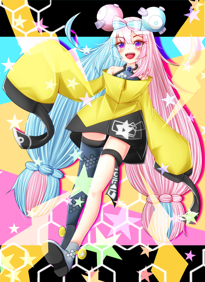 bow-shaped_hair character_hair_ornament grey_pantyhose hair_ornament hexagon_print iono_(pokemon) jacket leon_no_neko long_hair long_sleeves low-tied_long_hair multicolored_hair nintendo oversized_clothes pantyhose pokemon pokemon_scarlet_and_violet sharp_teeth single_leg_pantyhose sleeves_past_fingers sleeves_past_wrists split-color_hair teeth x_(symbol) yellow_jacket