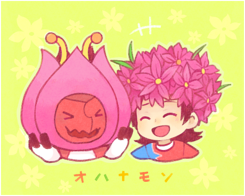 2boys closed_eyes digimon flower kudou_taiki leaf lowres multiple_boys ohanamon petals shoutmon smile
