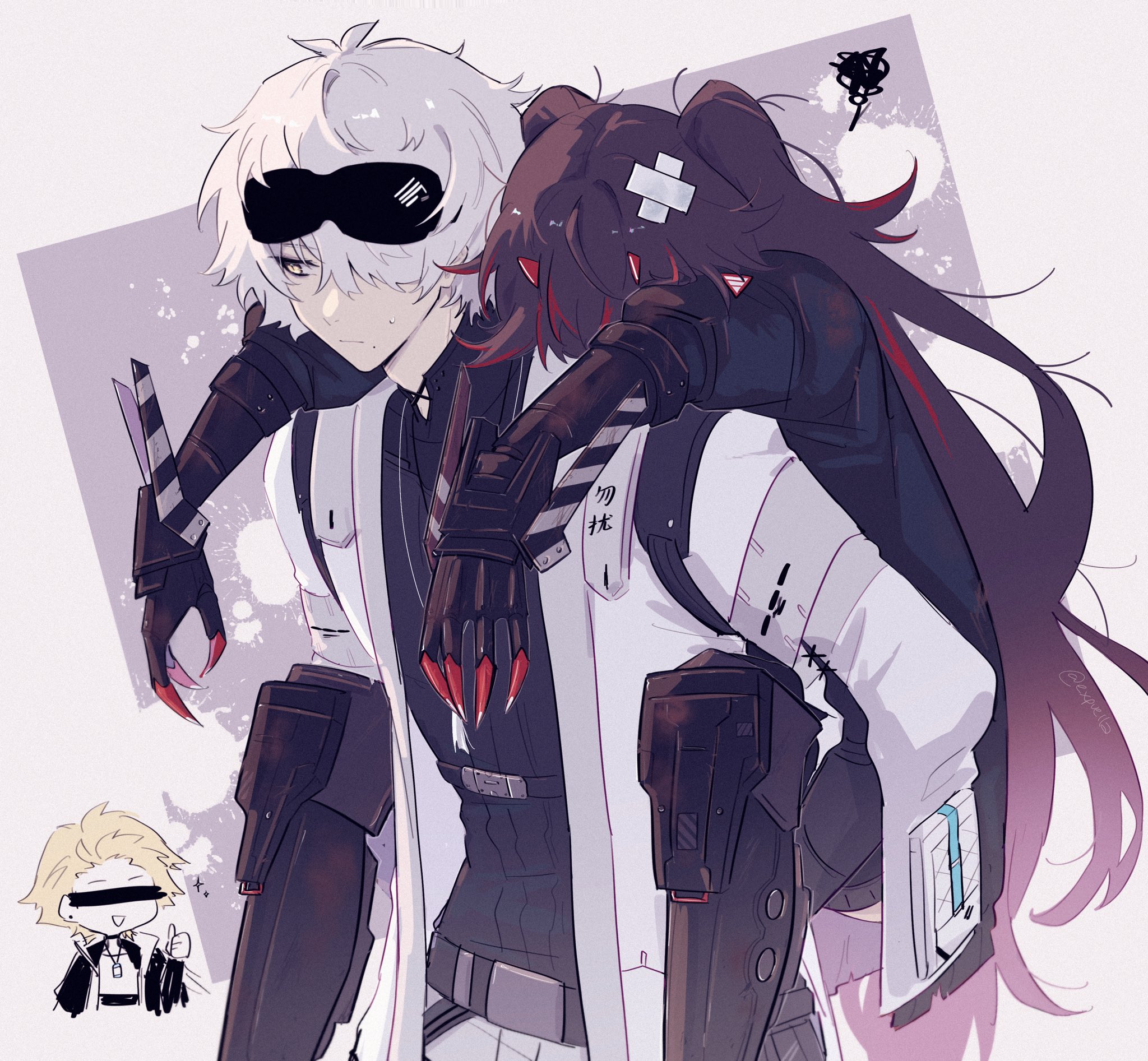 1girl 2boys bandaid bar_censor belt black_hair blonde_hair carrying censored chrome:_glory_(pgr) chrome_(pgr) fingernails frown hair_over_eyes highres injury lucia:_plume_(pgr) lucia_(pgr) mao_(expuella) mechabare mechanical_arms messy_hair multicolored_hair multiple_boys one_eye_covered piggyback punishing:_gray_raven red_hair sharp_fingernails sleep_mask smile twintails two-tone_hair wanshi:_hypnos_(pgr) wanshi_(pgr) white_hair yellow_eyes