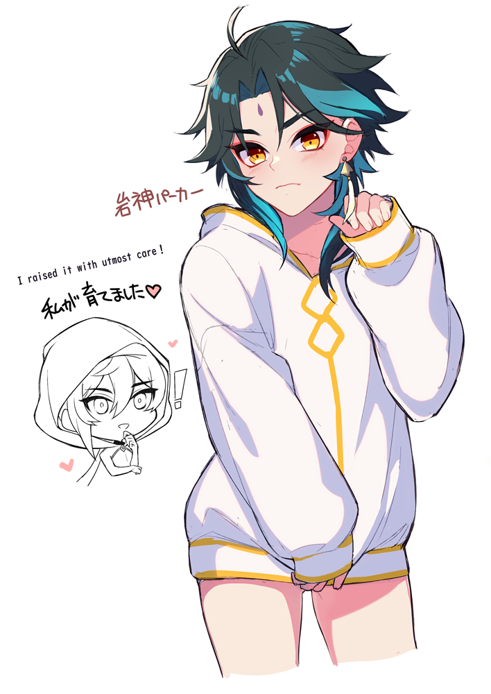 2boys alternate_costume bare_legs earrings forehead genshin_impact green_hair hood hoodie jewelry kh66gs long_sleeves male_focus multicolored_hair multiple_boys no_pants white_hood xiao_(genshin_impact) yellow_eyes zhongli_(genshin_impact)
