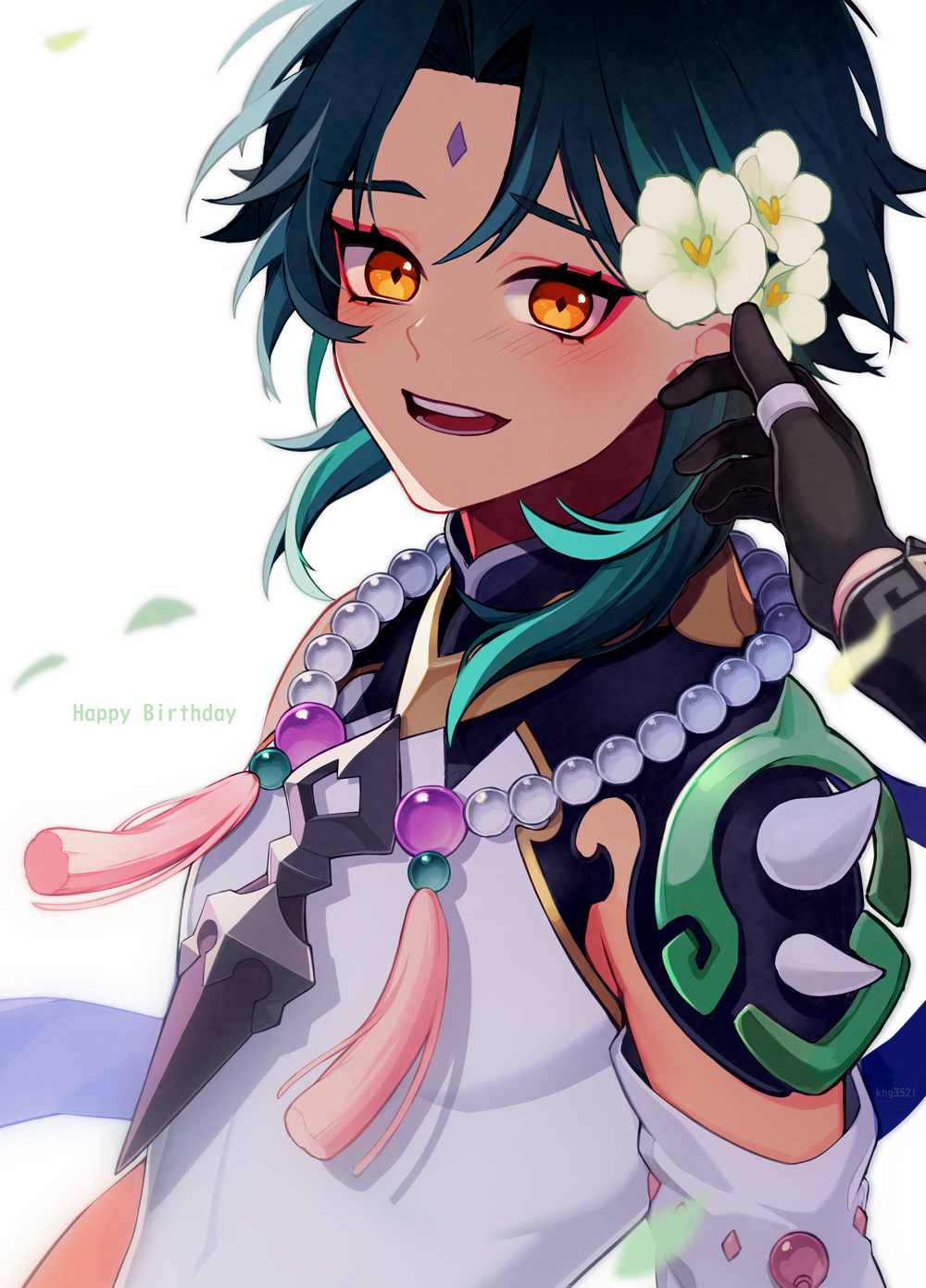 2boys armor asymmetrical_clothes bead_necklace beads black_gloves black_hair blush commentary_request detached_sleeves diamond-shaped_pupils diamond_(shape) eyeshadow facial_mark flower forehead_mark genshin_impact gloves green_hair hair_flower hair_ornament highres jewelry kh66gs long_sleeves makeup male_focus multicolored_hair multiple_boys necklace open_mouth parted_bangs pendant petals red_eyeshadow short_hair_with_long_locks shoulder_armor shoulder_pads shoulder_spikes simple_background single_bare_shoulder single_detached_sleeve slit_pupils smile solo_focus spikes symbol-shaped_pupils tassel thumb_ring two-tone_hair white_background white_flower xiao_(genshin_impact) yellow_eyes zhongli_(genshin_impact)
