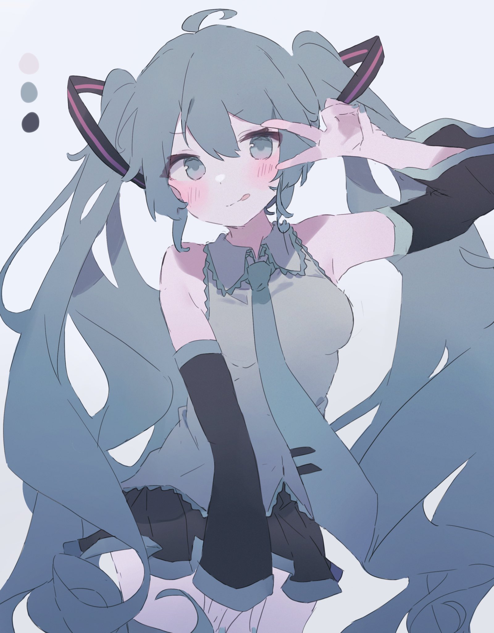 1girl ahoge armpits bad_id bad_twitter_id black_skirt blue_eyes blue_hair blush bunchi detached_sleeves hair_between_eyes hair_ornament hair_strand hand_up hands_up highres long_hair looking_at_viewer pleated_skirt shirt sidelocks simple_background skirt sleeveless sleeveless_shirt solo tongue tongue_out twintails v vocaloid