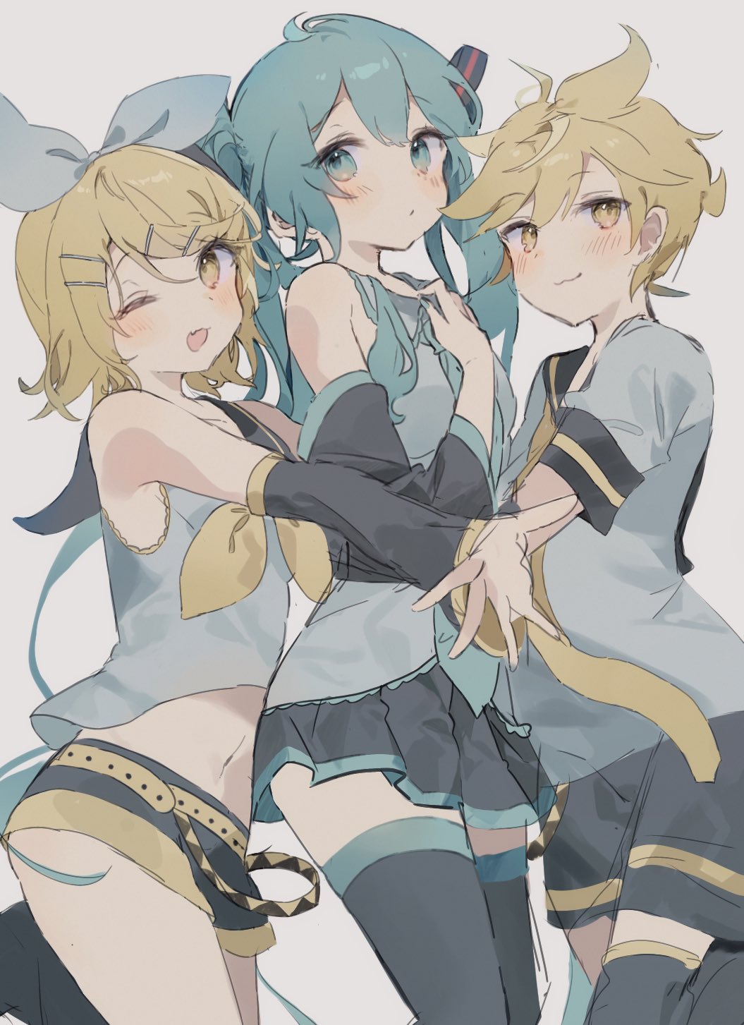 1boy 2girls :d armpits bad_id bad_twitter_id black_thighhighs blonde_hair blue_eyes blue_hair blush brother_and_sister bunchi detached_sleeves group_hug hair_between_eyes hair_ornament hair_ribbon hair_strand hairclip hatsune_miku highres hug kagamine_len kagamine_rin long_hair long_sleeves midriff multiple_girls one_eye_closed open_mouth pleated_skirt ribbon short_hair shorts siblings simple_background skirt smile thighhighs twintails vocaloid white_ribbon yellow_eyes