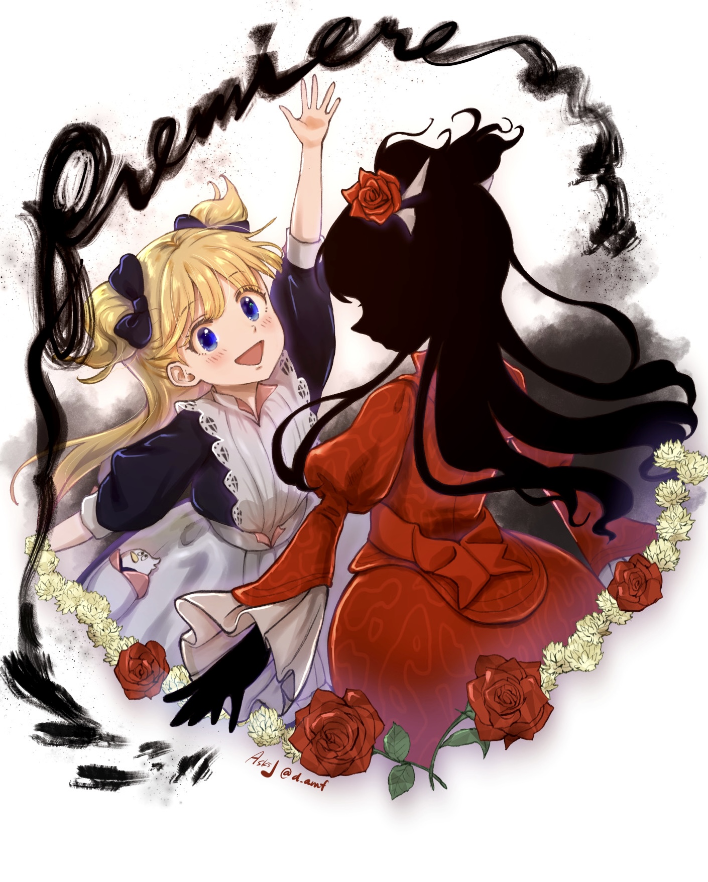 2girls apron asksj black_bow black_dress black_hair black_skin blonde_hair blue_eyes blunt_bangs blush bow colored_skin dress emilico_(shadows_house) flower hair_bow hair_flower hair_ornament highres kate_(shadows_house) long_hair long_sleeves multiple_girls open_mouth puffy_sleeves red_dress red_flower red_rose rose shadow_(shadows_house) shadows_house smile two_side_up white_apron