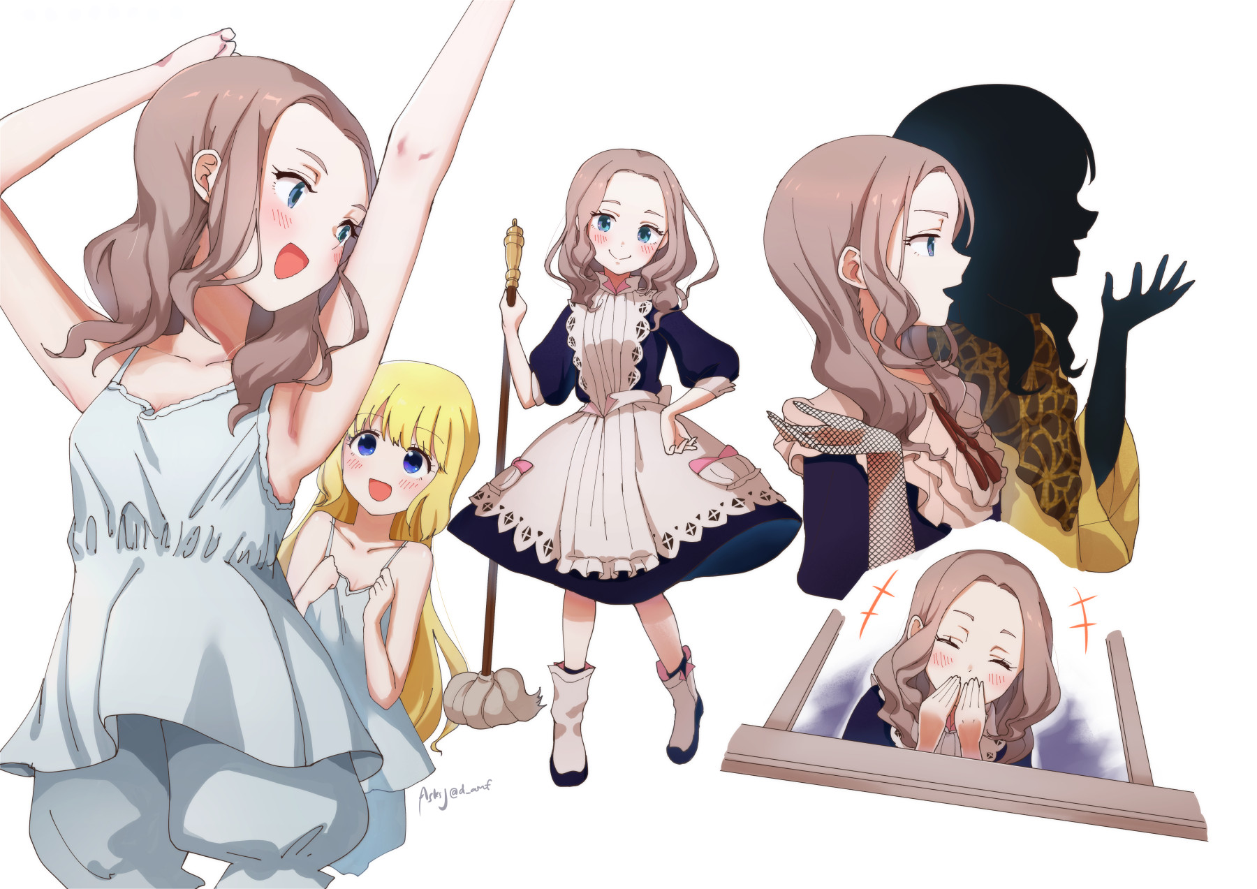 3girls apron asksj black_hair black_skin blonde_hair bloomers blue_dress blue_eyes blunt_bangs blush bow brown_hair colored_skin dress emilico_(shadows_house) hair_bow hair_ornament highres holding holding_mop long_hair long_sleeves looking_at_viewer medium_hair mia_(shadows_house) mop multiple_girls open_mouth ribbon sara_(shadows_house) shadow_(shadows_house) shadows_house shirt smile standing two_side_up underwear white_apron white_bloomers white_shirt yellow_dress