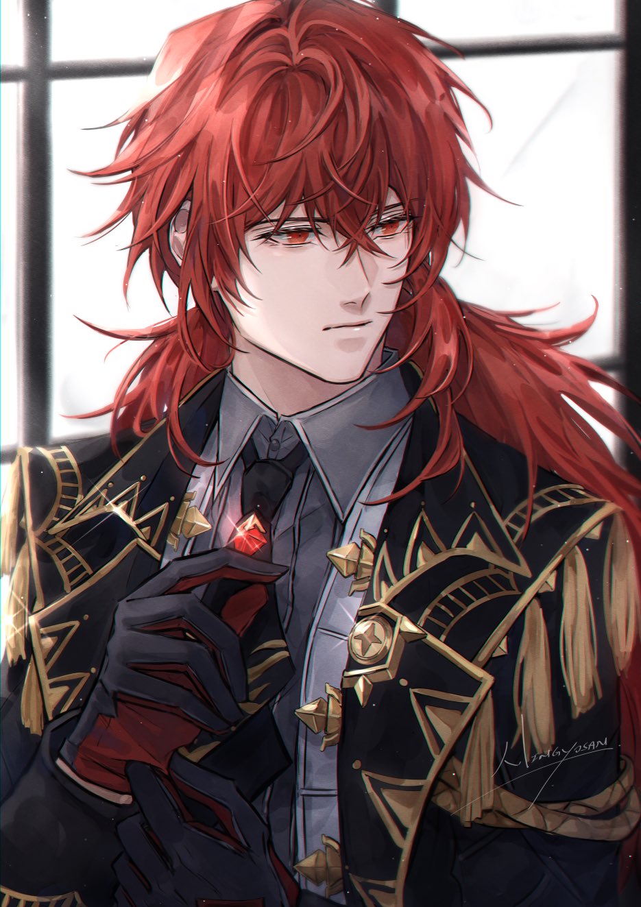1boy ascot black_ascot black_gloves black_jacket closed_mouth collared_shirt crossed_bangs diluc_(genshin_impact) gem genshin_impact gloves gold_trim grey_shirt hair_between_eyes highres jacket long_hair looking_to_the_side male_focus ningyo portrait red_eyes red_gloves red_hair shirt solo two-tone_gloves upper_body vest white_vest window
