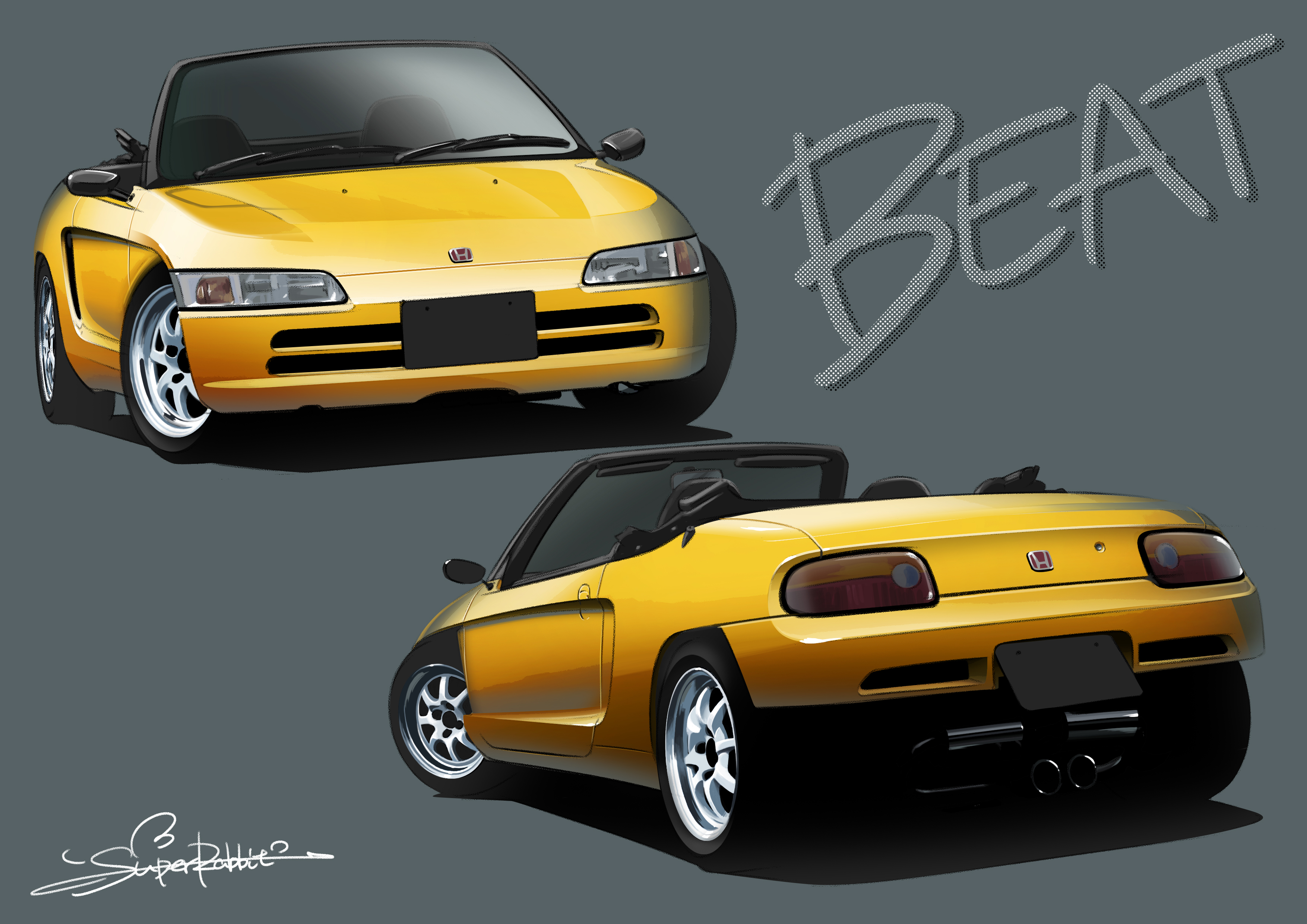 absurdres artist_name car convertible grey_background highres honda honda_beat motor_vehicle multiple_views no_humans original simple_background tsu-chan vehicle_focus vehicle_name