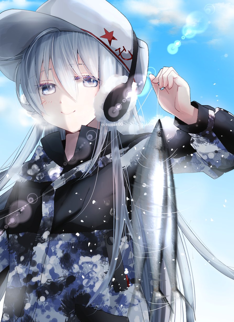 1girl blue_eyes blue_sky camouflage camouflage_jacket cloud commission earmuffs fish fishing_line flat_cap hammer_and_sickle hat hibiki_(kancolle) highres jacket kantai_collection kimura_shiki lens_flare official_alternate_costume skeb_commission sky solo star_(symbol) upper_body verniy_(kancolle) verniy_(saury_festival)_(kancolle) white_hair white_hat