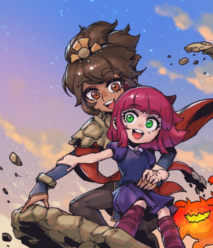 2girls :d annie_(league_of_legends) black_dress blush brown_hair cloud dark-skinned_female dark_skin dress green_eyes hair_ornament horns kneehighs league_of_legends long_sleeves monster multiple_girls open_mouth outdoors phantom_cross puffy_short_sleeves puffy_sleeves red_hair rock short_hair short_sleeves smile socks taliyah teeth upper_teeth_only