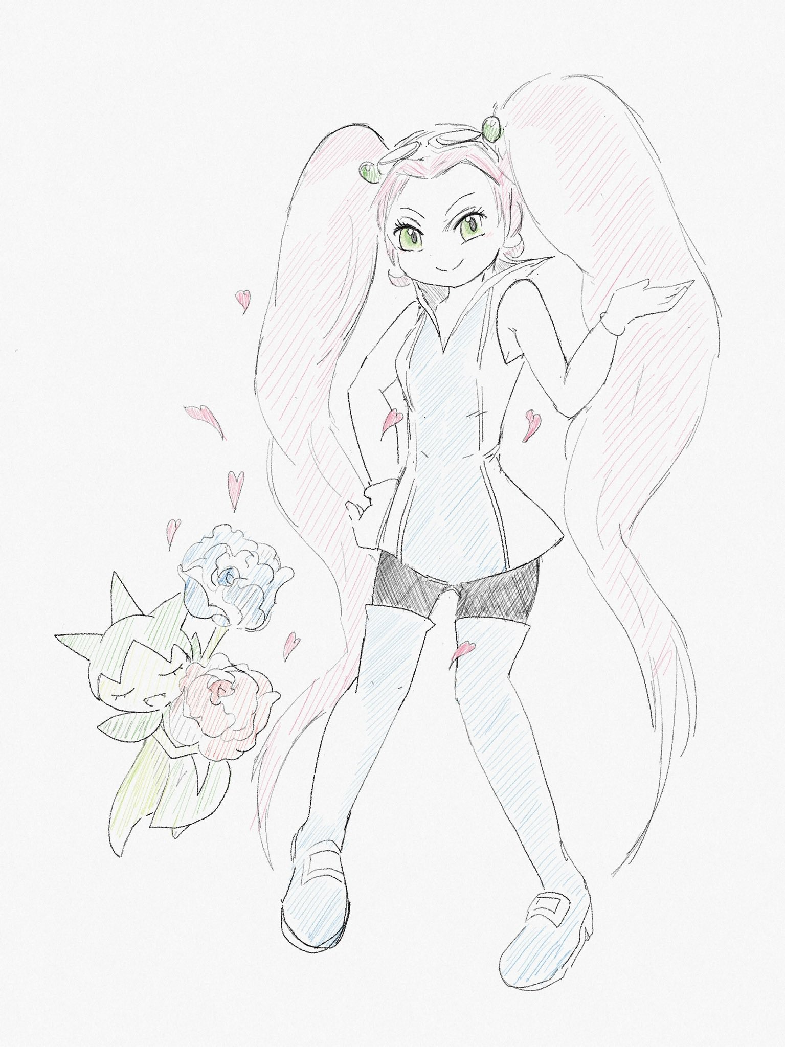 2girls arm_up bare_shoulders black_leggings blue_flower blue_footwear blue_rose blue_shirt boots breasts cleavage closed_eyes closed_mouth colored_skin eyewear_on_head female_focus flower forehead gen_3_pokemon gloves goggles green_eyes green_skin hand_on_own_hip hand_up happy highres leggings long_hair looking_at_viewer lovrina_(pokemon) monster_girl multiple_girls munna_(pixiv_4032814) nintendo open_mouth petals pink_hair plant_girl pokemon pokemon_(creature) pokemon_xd red_flower red_rose rose roselia_(pokemon) shirt sidelocks simple_background sketch sleeveless sleeveless_shirt small_breasts smile split_mouth thigh_boots traditional_media twintails u_u v-shaped_eyebrows very_long_hair white_background