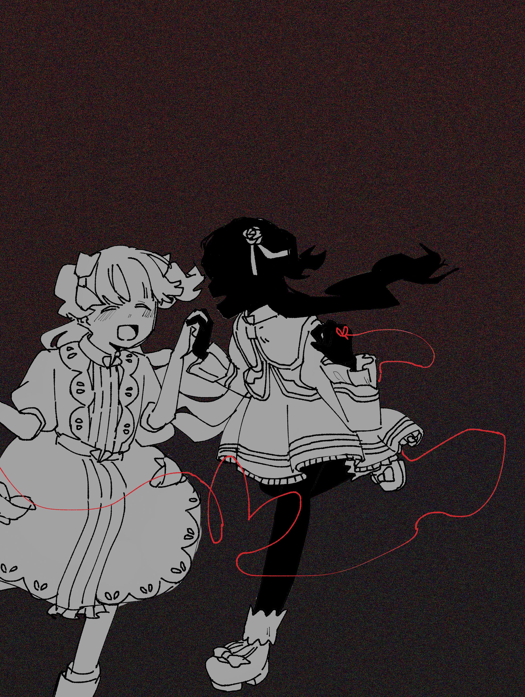 2girls absurdres center_frills closed_eyes commentary dress emilico_(shadows_house) english_commentary film_grain flower frills hair_flower hair_ornament hair_ribbon highres hoi_plantmaster holding_hands kate_(shadows_house) limited_palette long_hair looking_at_another multiple_girls open_mouth ribbon rose running shadow_(shadows_house) shadows_house smile string string_of_fate two_side_up yuri
