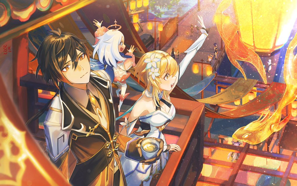 2boys 4girls black_gloves black_hair blonde_hair breasts brown_hair chongyun_(genshin_impact) coat cup detached_sleeves double_bun dress flower genshin_impact gloves guoba_(genshin_impact) hair_bun hair_flower hair_ornament halo holding holding_cup jewelry keqing_(genshin_impact) lantern long_hair lumine_(genshin_impact) medium_breasts multicolored_hair multiple_boys multiple_girls night orange_eyes outdoors paimon_(genshin_impact) paper_lantern partially_fingerless_gloves romper short_hair_with_long_locks standing white_dress white_romper xiangling_(genshin_impact) ze123456n zhongli_(genshin_impact)