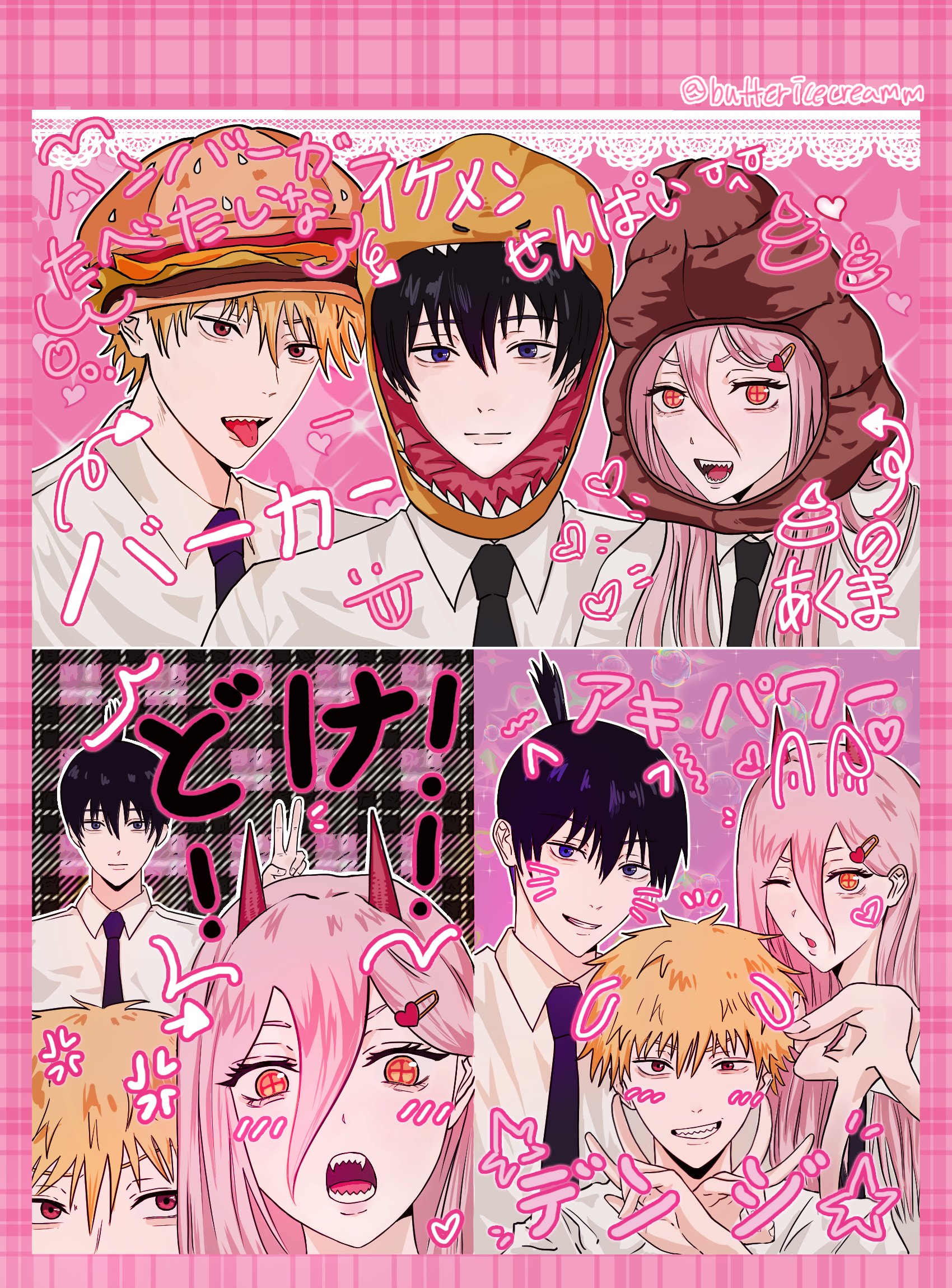 1girl 2girls black_hair black_necktie blonde_hair blue_eyes burger_hat buttericecreamm chainsaw_man closed_mouth collared_shirt cross-shaped_pupils denji_(chainsaw_man) dinosaur_hood drawn_horns drawn_whiskers face_filter group_picture hair_ornament hairclip hayakawa_aki heart heart_hair_ornament highres horns long_hair looking_at_viewer multiple_girls necktie open_mouth pink_hair pink_theme plaid_background pout power_(chainsaw_man) purikura red_eyes red_horns sharp_teeth shirt short_hair smile spiked_hair symbol-shaped_pupils teeth topknot v white_shirt