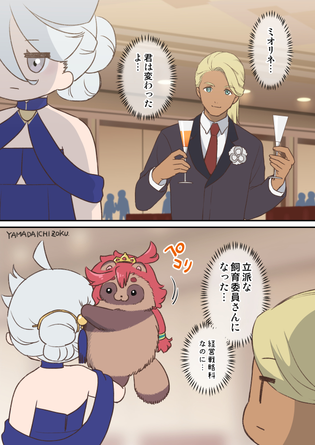 1boy 2girls 2koma ahoge animal animal_on_shoulder blonde_hair blue_dress comic cup dark-skinned_male dark_skin dress drinking_glass green_eyes grey_eyes grey_hair gundam gundam_suisei_no_majo hair_between_eyes holding indoors long_hair miorine_rembran multiple_girls red_hair shaddiq_zennelli suletta_mercury swept_bangs tanuki tiara yamada_ichizoku