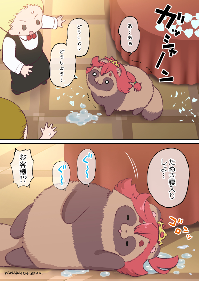 2koma ahoge broken_glass closed_eyes comic glass gundam gundam_suisei_no_majo indoors long_hair low_ponytail lying on_floor on_side ponytail red_hair sleeping suletta_mercury swept_bangs tanuki tiara trembling water yamada_ichizoku
