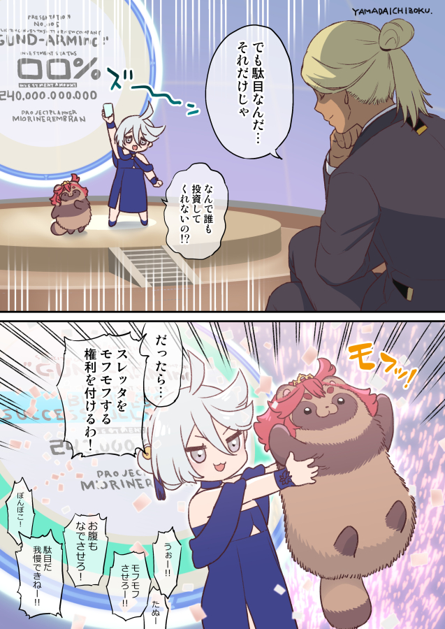 2girls 2koma :3 ahoge comic grey_eyes grey_hair gundam gundam_suisei_no_majo hair_between_eyes holding long_hair miorine_rembran multiple_girls open_mouth red_hair smile suletta_mercury swept_bangs tanuki yamada_ichizoku