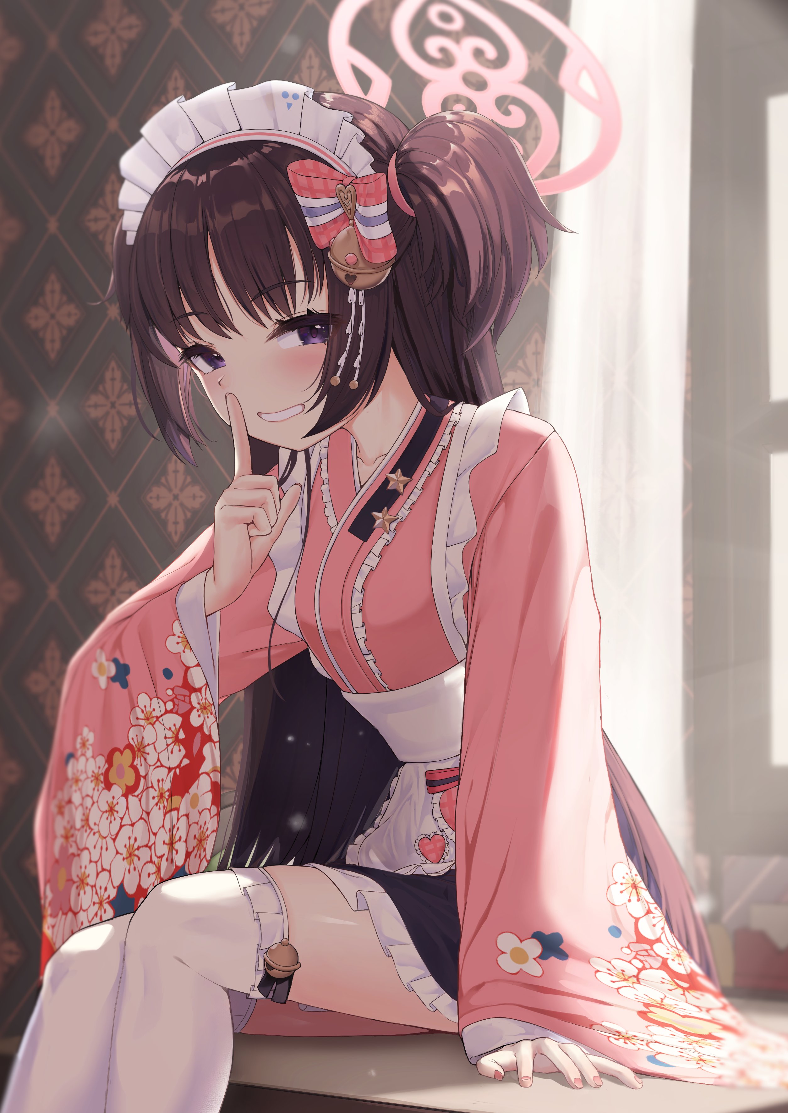 absurdres apron bell blue_archive bow brown_hair frilled_apron frills hair_bell hair_bow hair_ornament halo highres japanese_clothes maid maid_headdress purple_eyes shizuko_(blue_archive) toshise. two_side_up wa_maid waist_apron wide_sleeves