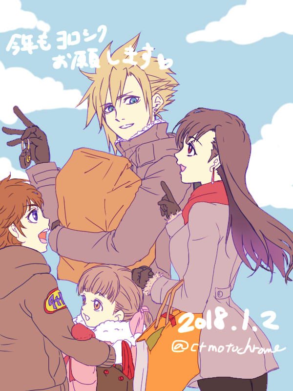 2boys 2girls bag black_hair blonde_hair blue_eyes blue_sky brown_eyes brown_hair child cloud cloud_strife cloudy_sky coat dated denzel_(ff7) earrings family final_fantasy final_fantasy_vii final_fantasy_vii:_advent_children gloves holding jewelry long_hair looking_at_another marlene_wallace multiple_boys multiple_girls outdoors red_eyes scarf shopping_bag sky spiked_hair square_enix tifa_lockhart winter_clothes