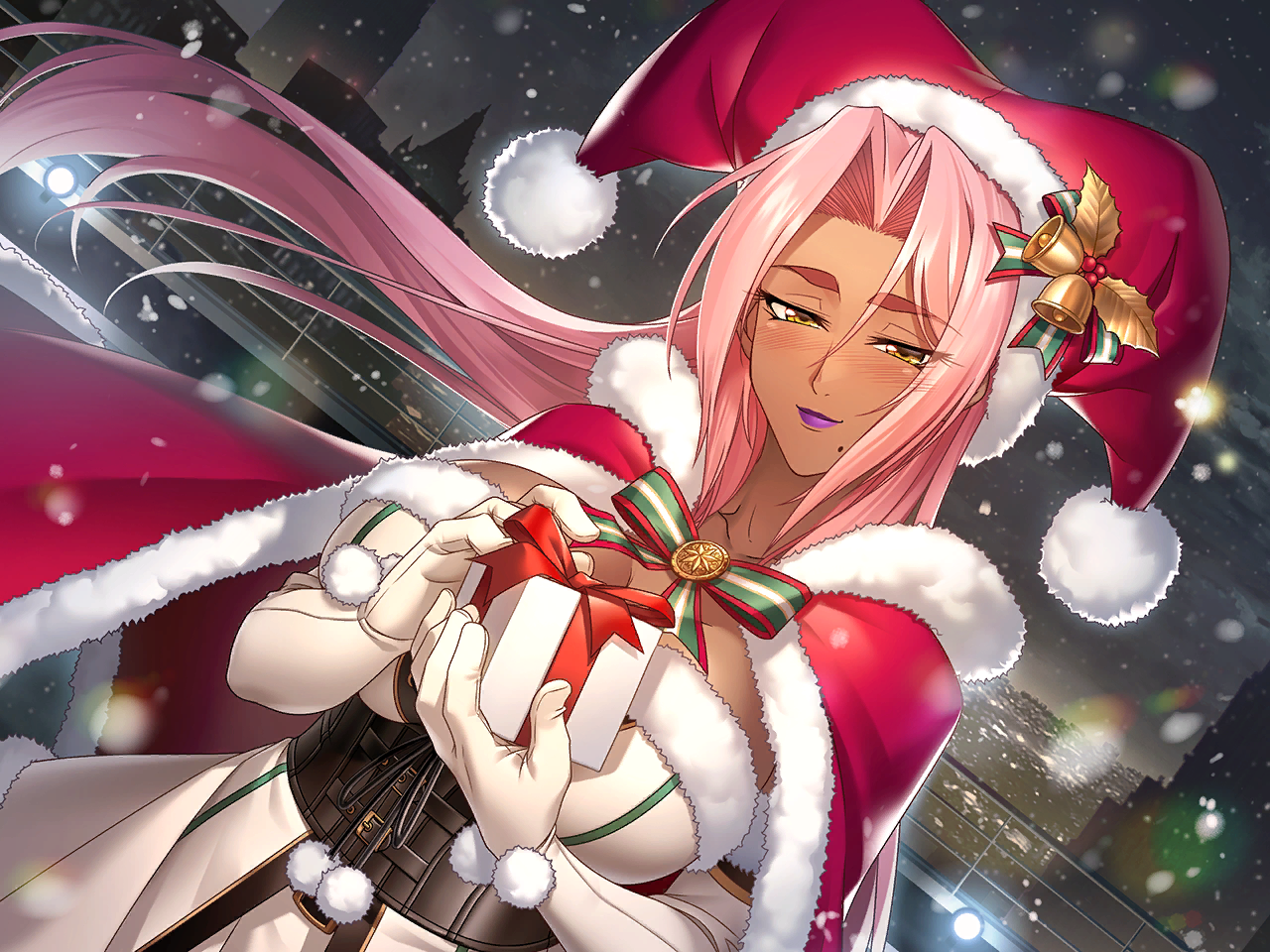 1girl blush christmas christmas_present cityscape gift ingrid_(taimanin_asagi) kagami_hirotaka santa_costume taimanin_(series)