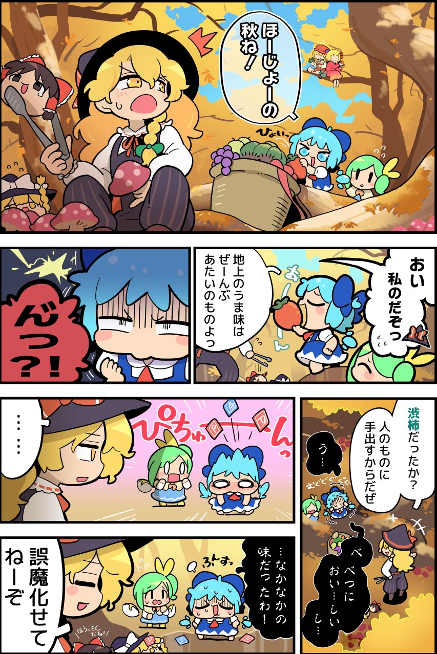 6+girls :d :o =_= aki_minoriko aki_shizuha ascot autumn basket black_pants black_vest blonde_hair blue_bow blue_dress blue_eyes blue_hair bow braid brown_hair bucket chibi cirno closed_eyes commentary_request daiyousei dress earrings fairy fairy_wings food fruit grapes green_bow green_hair hair_bow hair_ornament hair_tubes hakurei_reimu hat hat_bow hat_ornament highres holding holding_food holding_fruit holding_tongs hypocrisy jewelry kirisame_marisa long_sleeves mob_cap moyazou_(kitaguni_moyashi_seizoujo) multiple_girls mushroom no_eyes open_mouth orange_headwear outdoors paint paintbrush pants persimmon power-up power_item_(touhou) puffy_long_sleeves puffy_short_sleeves puffy_sleeves red_ascot red_bow red_dress red_ribbon ribbon shirt short_hair short_sleeves sitting smile tongs touhou translation_request tree vest white_bow white_shirt wings witch_hat yellow_bow yellow_eyes yukkuri_shiteitte_ne |_|