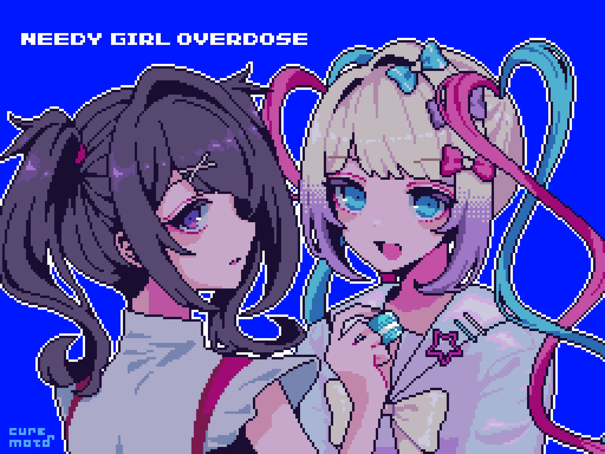 2girls ame-chan_(needy_girl_overdose) black_hair blonde_hair blue_eyes blue_hair bow chouzetsusaikawa_tenshi-chan food hair_bow hair_ornament hair_over_one_eye heart highres holding kyua_moto long_hair long_sleeves looking_at_viewer macaron multicolored_hair multiple_girls needy_girl_overdose open_mouth pink_hair pixel_art quad_tails sailor_collar school_uniform serafuku shirt smile twintails x_hair_ornament