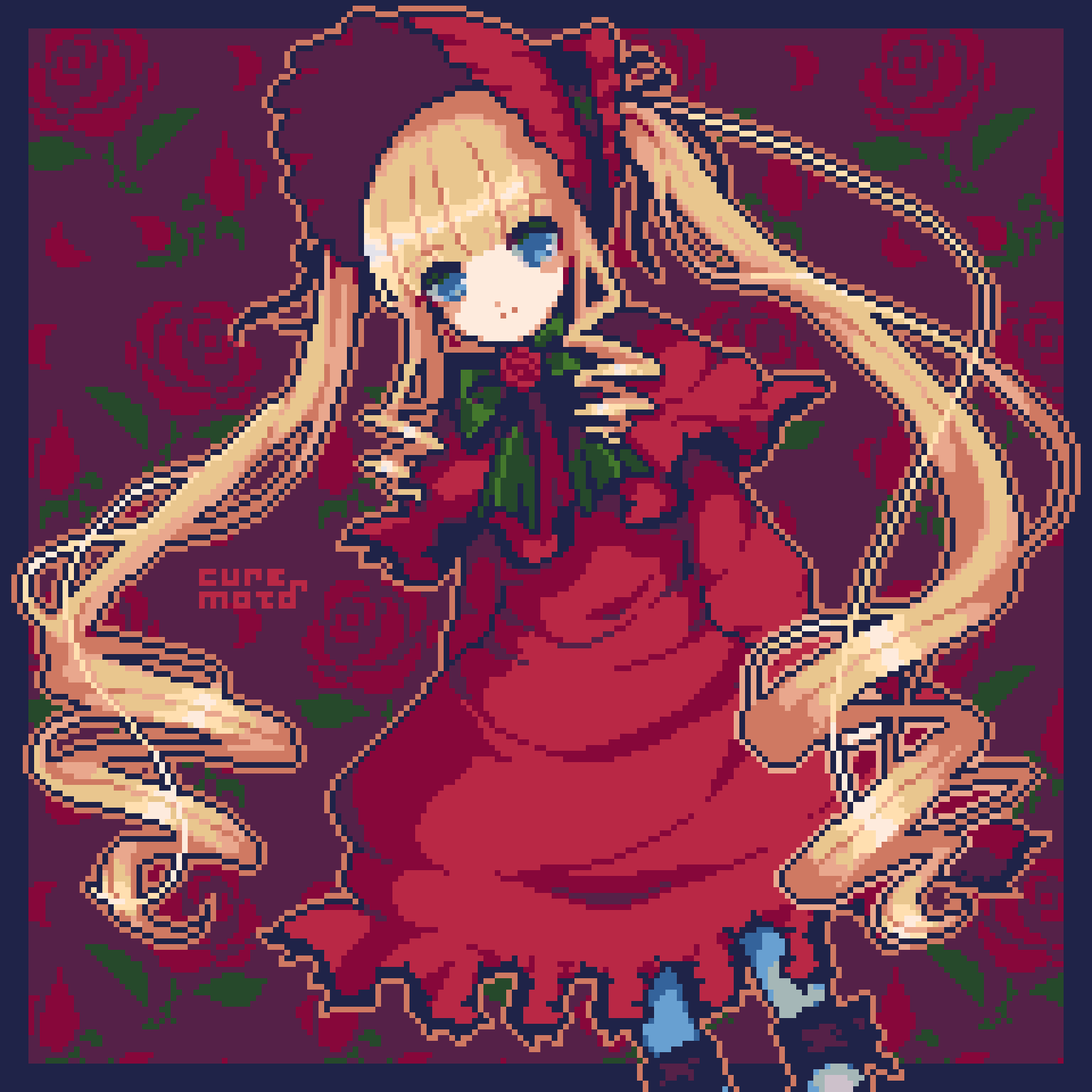 1girl blonde_hair blue_eyes bonnet bow bowtie capelet dress drill_hair flower flower_ornament frilled_dress frilled_sleeves frills green_bow green_bowtie highres kyua_moto lolita_fashion long_hair long_sleeves pixel_art red_capelet red_dress red_flower red_headwear red_rose rose rozen_maiden shinku sidelocks solo twintails