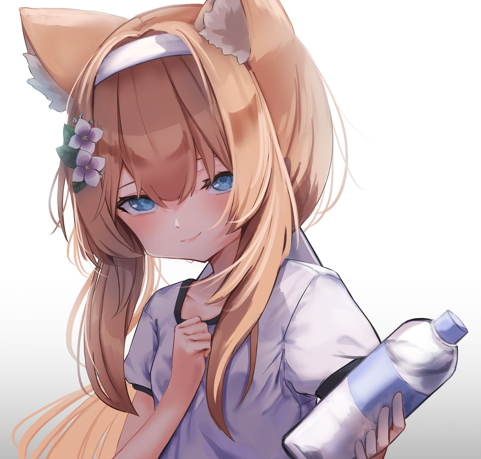 1girl animal_ears blonde_hair blue_archive blue_eyes bottle cat_ears flower hair_flower hair_ornament hairband hand_on_own_chest highres logiclr long_hair mari_(blue_archive) mari_(track)_(blue_archive) sidelocks simple_background smile solo water_bottle