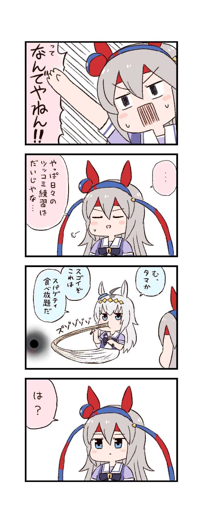 2girls 4koma animal_ears batta_(ijigen_debris) black_hole blue_eyes blush_stickers chibi comic eating highres horse_ears long_hair multiple_girls oguri_cap_(umamusume) school_uniform tamamo_cross_(umamusume) tracen_school_uniform translated tsukkomi umamusume white_hair