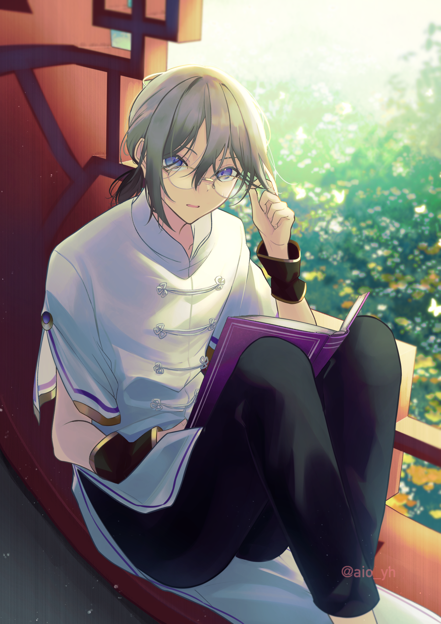 1boy adjusting_eyewear bishounen blue_eyes book english_text fate/grand_order fate_(series) glasses hair_between_eyes highres looking_at_viewer male_focus open_mouth prince_of_lan_ling_(fate) shin'ya_(yukiura) short_sleeves sitting twitter_username