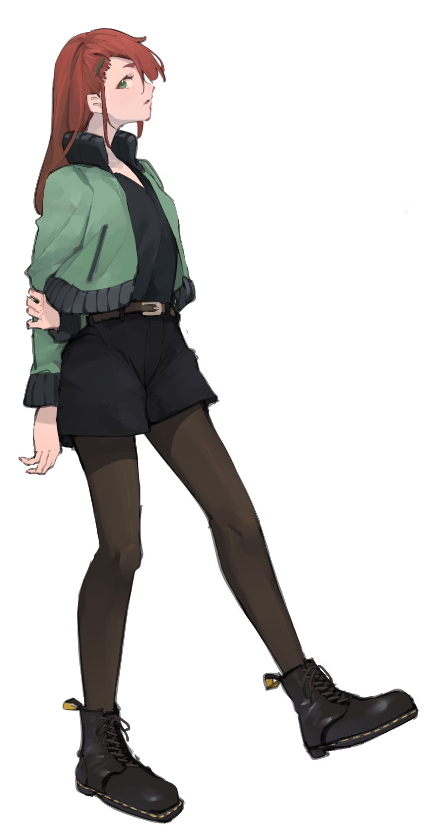 1girl ankle_boots arms_behind_back belt black_boots black_shirt black_shorts boots brown_belt brown_pantyhose copyright_request from_side full_body gochiwa green_eyes green_jacket hair_ornament hairclip highres jacket long_hair looking_at_viewer one-hour_drawing_challenge open_clothes open_jacket pantyhose parted_lips profile red_hair shirt short_shorts shorts sideways_glance simple_background solo white_background