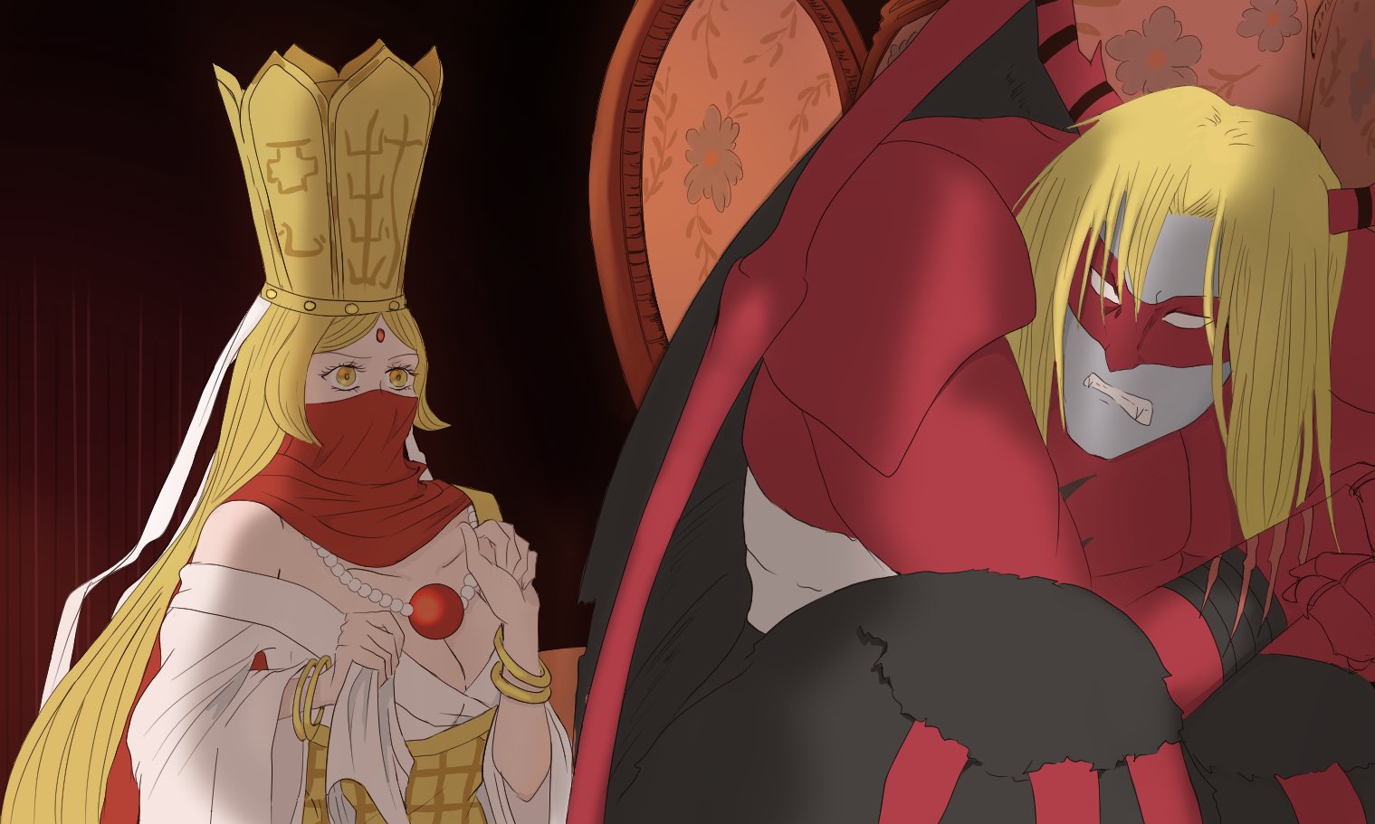 1boy 1girl breasts demon derivative_work digimon digimon_(creature) disney disneymonredraw_(meme) large_breasts looking_at_another mask meme sanzomon screenshot_redraw vampire venomvamdemon yellow_eyes