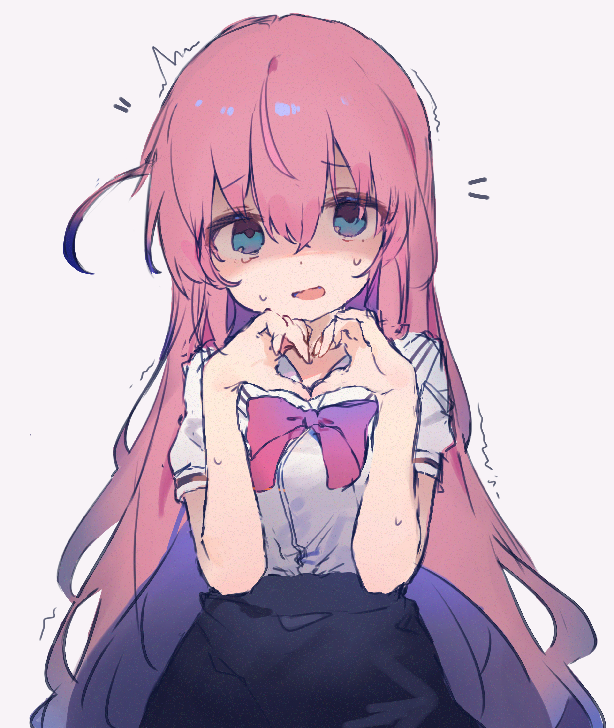 1girl absurdres bocchi_the_rock! bow bowtie bunchi commentary gotoh_hitori hair_between_eyes hair_strand hands_up heart heart_hands high-waist_skirt highres long_hair looking_at_viewer pink_bow pink_bowtie pink_eyes pink_hair pink_ribbon puffy_short_sleeves puffy_sleeves ribbon school_uniform shirt shirt_tucked_in short_sleeves shy side_ahoge simple_background skirt solo straight-on tearing_up tears trembling upper_body white_background white_shirt
