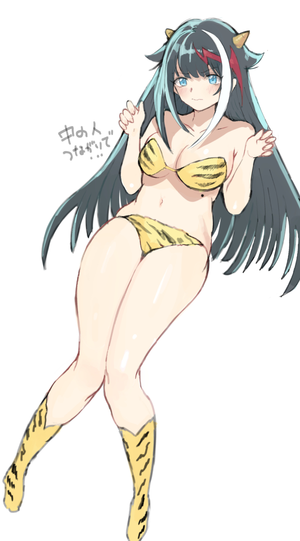 1girl azur_lane bikini black_choker black_hair blue_eyes blush boots choker cosplay deutschland_(azur_lane) lum lum_(cosplay) mole multicolored_hair strapless strapless_bikini streaked_hair swimsuit takeakigaku thick_thighs thighs tiger_stripes urusei_yatsura voice_actor_connection