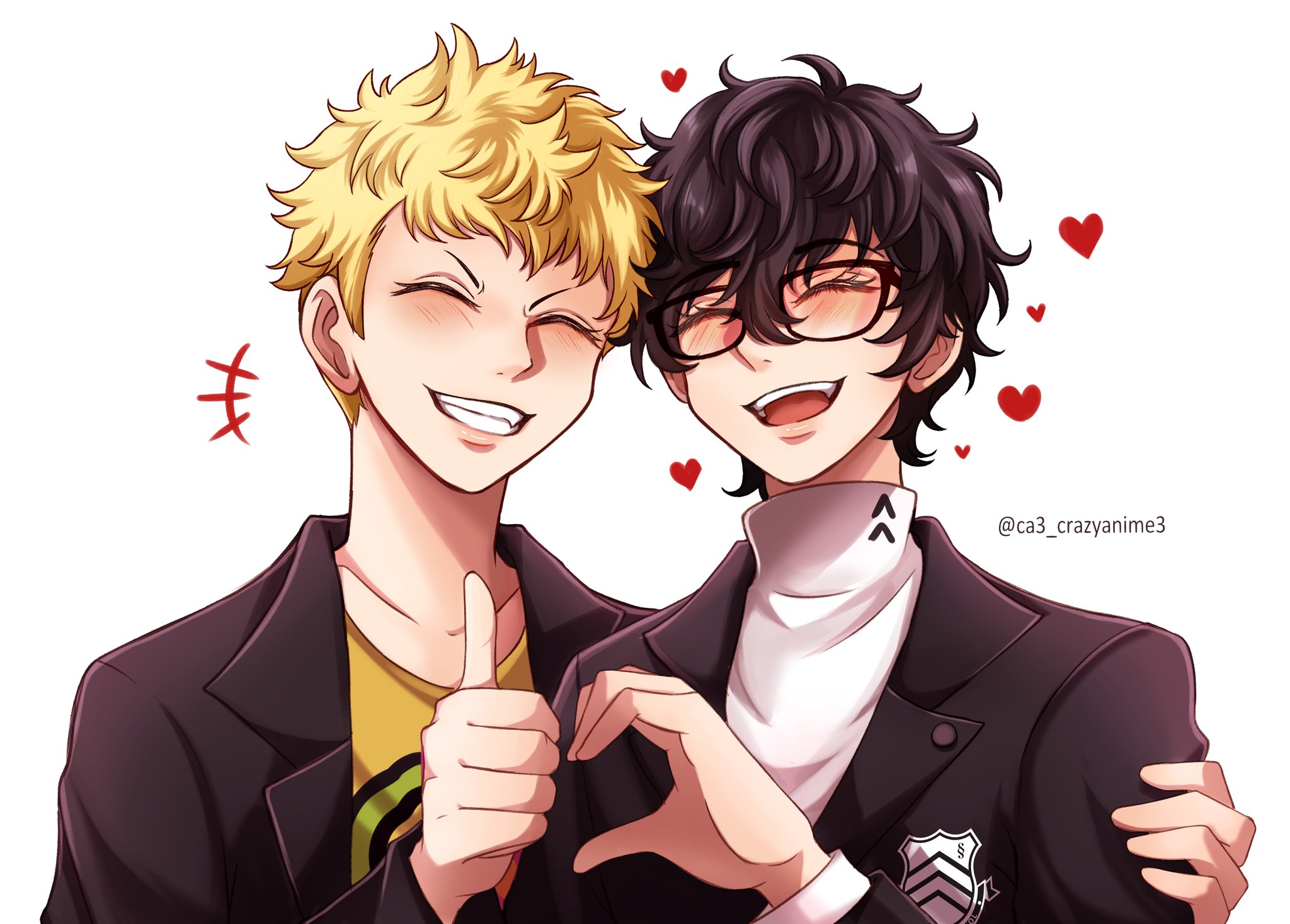2boys ^_^ amamiya_ren artist_name black_hair blonde_hair blush closed_eyes commentary crazyanime3 english_commentary facing_viewer glasses grin heart heart_hands_failure highres hug jacket male_focus multiple_boys open_clothes open_jacket open_mouth persona persona_5 sakamoto_ryuuji school_uniform shirt short_hair shuujin_academy_school_uniform smile teeth thumbs_up upper_body white_background yellow_shirt