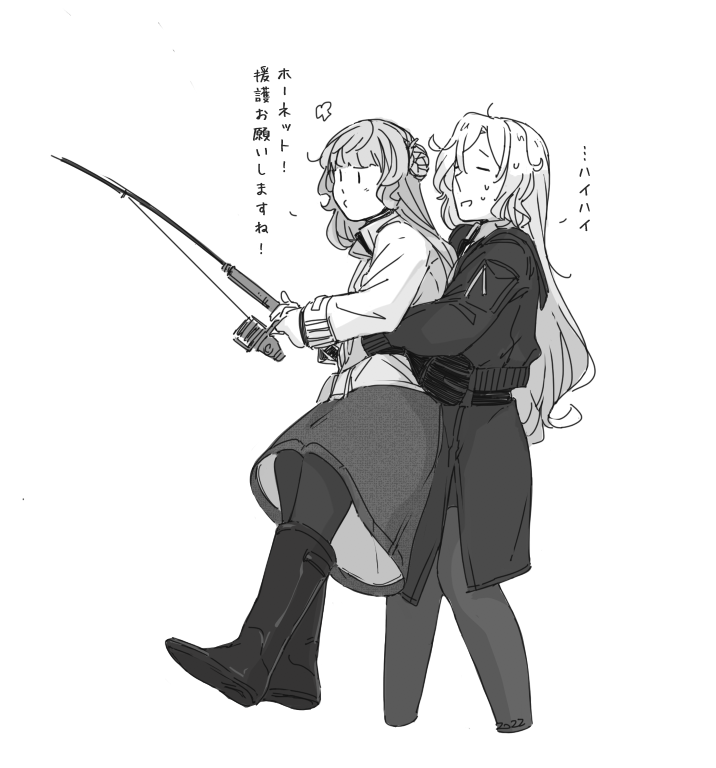 2girls bomber_jacket boots carrying closed_eyes commentary_request cropped_legs double_bun feet_out_of_frame fishing_rod greyscale hair_bun hornet_(kancolle) jacket kantai_collection long_hair monochrome multiple_girls official_alternate_costume pantyhose ranger_(kancolle) ranger_(saury_festival)_(kancolle) rubber_boots skirt translation_request weidashming