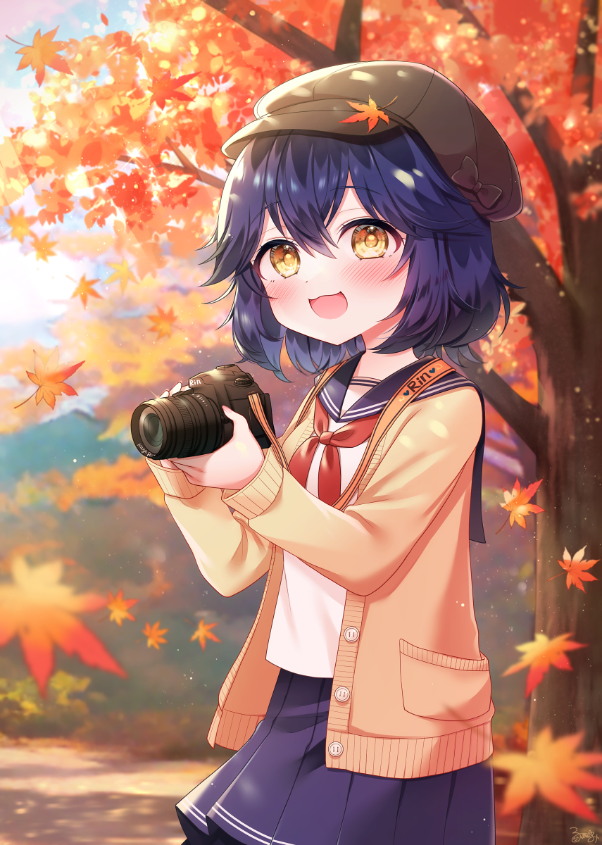 1girl :3 :d autumn autumn_leaves blue_hair blush bow newsboy_cap camera camera_around_neck cardigan dappled_sunlight hat hat_bow highres holding holding_camera leaf leaf_on_head long_sleeves looking_at_viewer maple_leaf nanase_(ribonshitoron) neckerchief open_mouth original outdoors pleated_skirt school_uniform serafuku short_hair skirt smile solo sunlight tree yellow_eyes